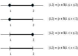 Definition 2.9 Zusammenhängende Teilmengen der reellen Zahlen heißen Intervalle. Für \(a,b\in \mathbb{R}\) unterscheidet man
