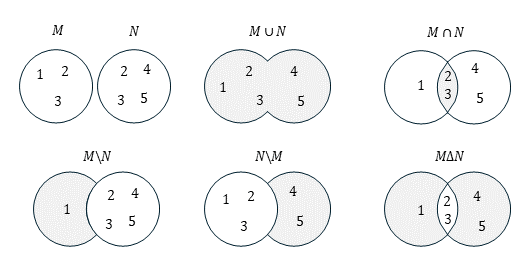 - \(M \Delta N = \{1,4,5\}\), weil \(1 \in M\), aber \(1 \notin \{2,3\}\), \(2 \in M\), aber \(2 \in \{2,3\}\), \(3 \in M\), aber \(3 \in \{2,3\}\), \(4 \in N\), aber \(4 \notin \{2,3\}\) und \(5 \in N\), aber \(5 \notin \{2,3\}\).