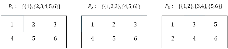 Als Beispiel betrachten wir die Menge \(M := \{1,2,3,4,5,6\}\). Dann sind \(P_1 := \{\{1\}, \{2,3,4,5,6\}\}\), \(P_2 := \{\{1,2,3\}, \{4,5,6\}\}\) und \(P_3 := \{\{1,2\},\{3,4\}, \{5,6\}\}\) drei mögliche Partitionen von \(M\). Abbildung 2.3 visualisiert die in diesem Beispiel betrachteten Partitionen.