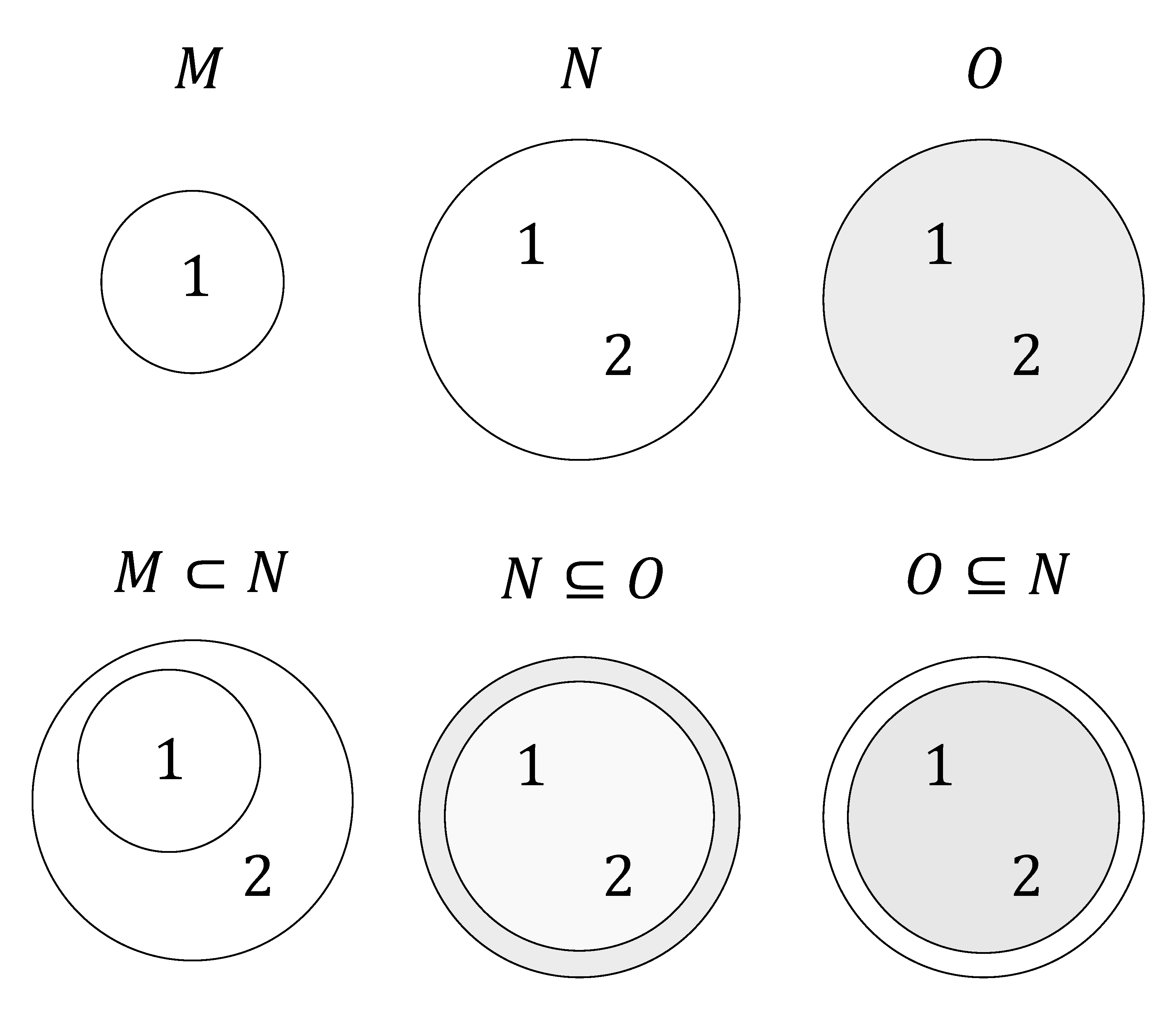 Betrachten wir zum Beispiel die Mengen \(M := \{1\}\), \(N := \{1,2\}\), und \(O := \{1,2\}\). Dann gilt mit obigen Definitionen, dass \(M \subset N\), weil \(1 \in M\) und \(1 \in N\), aber \(2 \in N\) und \(2 \notin M\). Weiterhin gilt, dass \(N \subseteq O\), weil \(1 \in N\) und \(1 \in O\) sowie \(2 \in N\) und \(2 \in O\) und es kein Element von \(O\) gibt, welches nicht in \(N\) ist. Ebenso gilt \(O \subseteq N\), weil \(1 \in O\) und \(1 \in N\) sowie \(2 \in O\) und \(2 \in N\) und es kein Element von \(N\) gibt, welches nicht in \(O\) ist. Schließlich gilt sogar \(N = O\), weil für jedes Element \(n \in N\) gilt, dass auch \(n \in O\), und gleichzeitig für jedes Element \(o \in O\) gilt, dass auch \(o\in N\). Wir stellen diese Zusammenhänge schematisch mithilfe von Venn-Euler-Diagrammen in Abbildung 2.1 dar.