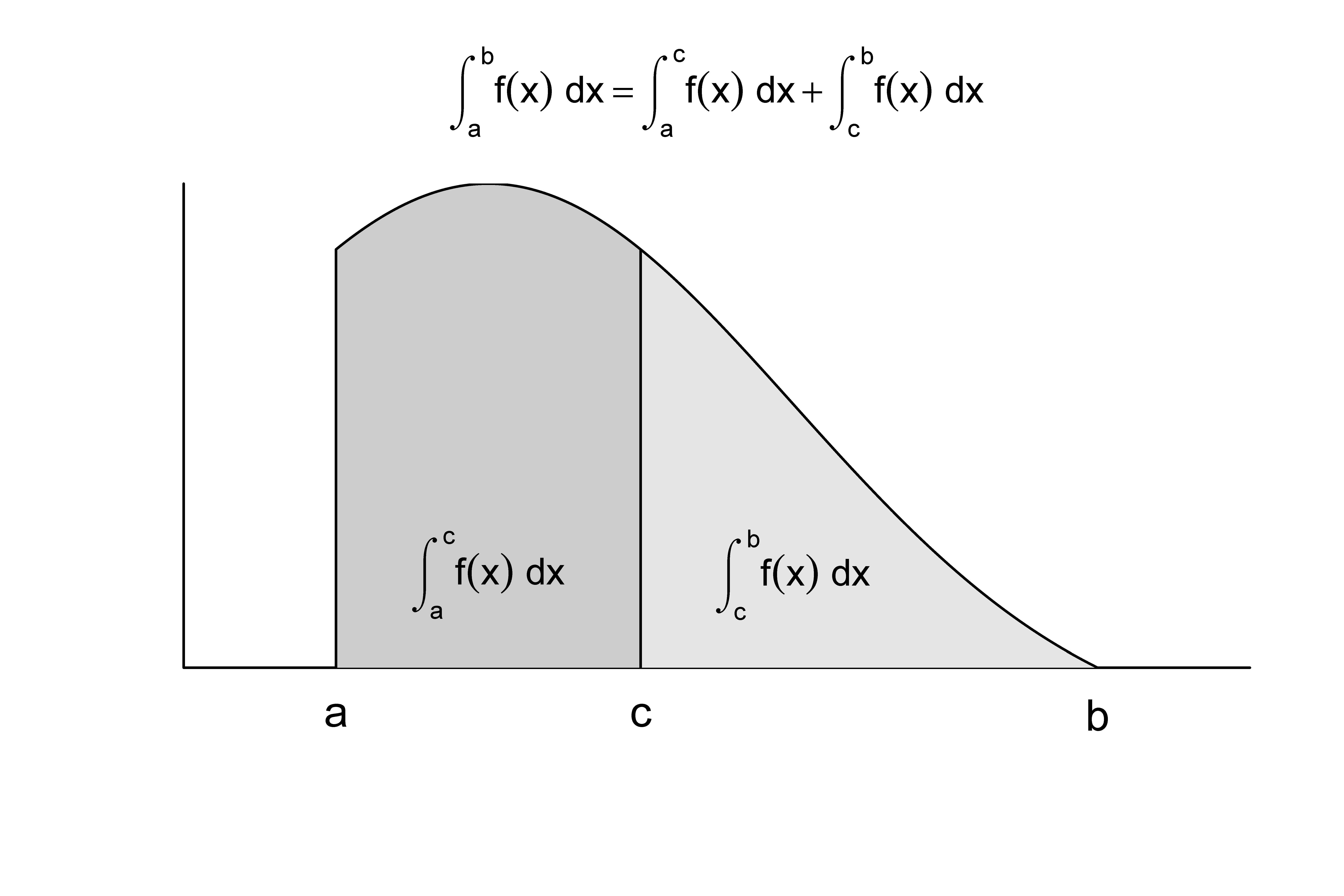 Additivität. Für \(a < c < b\) gilt \[\begin{equation} \int_a^b f(x)\,dx = \int_a^c f(x)\,dx + \int_c^b f(x)\,dx. \end{equation}\]