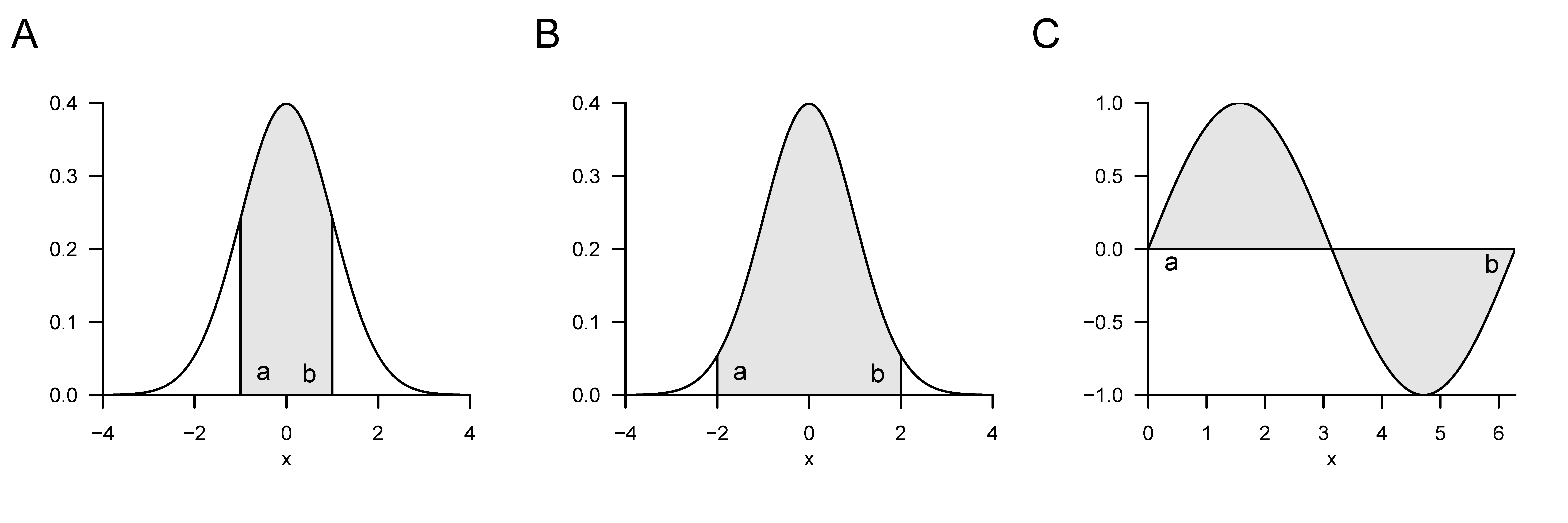 Anschaulich entspricht ein bestimmtes Integral der vorzeichenbehafteten und auf ein Intervall \([a,b]\) beschränkten Fläche zwischen dem Graphen einer Funktion \(f\) und der \(x\)-Achse (vgl. Abbildung 7.1). Vorzeichenbehaftet heißt dabei, dass Flächen zwischen der \(x\)-Achse und positiven Werten von \(f\) positiv zur Fläche beitragen, Flächen zwischen der \(x\) und negativen Werten von \(f\) dagegen negativ. So ergeben sich zum Beispiel der Wert des in Abbildung 7.1 A gezeigten bestimmten Integral zu 0.68, der Wert des in Abbildung Abbildung 7.1 B gezeigten bestimmten Integrals zu 0.95 (die eingezeichnete Fläche ist offensichtlich größer als in Abbildung 7.1 A) und der Wert des in Abbildung 7.1 C gezeigten bestimmten Integrals zu 0 (die eingezeichneten positiven und negativen Flächen gleichen sich genau aus). Letzteres Beispiel legt auch die Interpretation des Integrals als Durchschnittswert einer Funktion \(f\) über einem Intervall \([a,b]\) nahe.