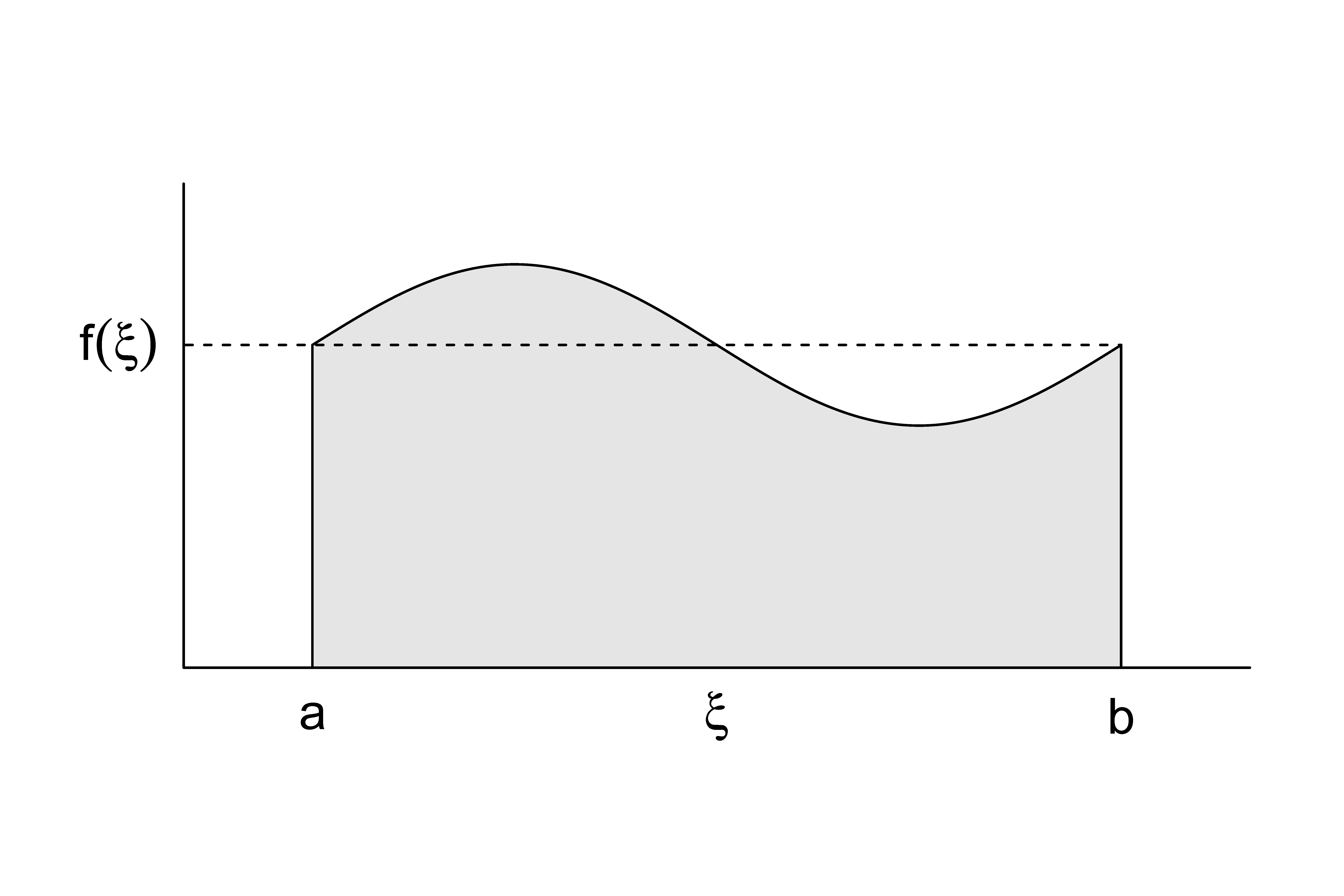 Theorem 7.3 (Mittelwertsatz der Integralrechnung) Für eine stetige Funktion \(f : [a,b] \to \mathbb{R}\) existiert ein \(\xi \in ]a,b[\) mit \[\begin{equation} \int_a^b f(x)\,dx = f(\xi)(b-a) \end{equation}\]