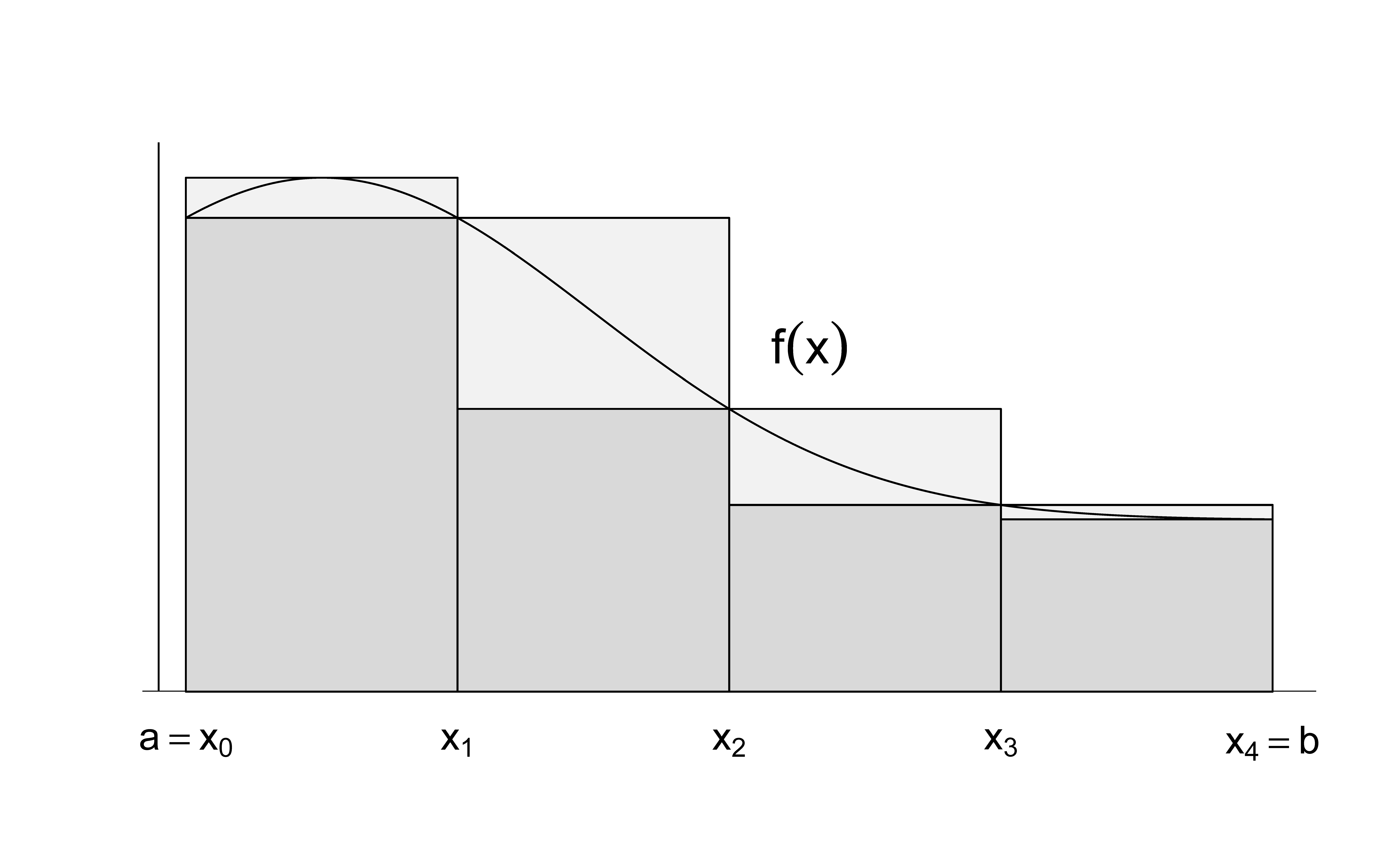 Wählt man zum Beispiel in der Riemannschen Summe in jedem Teilintervall das Maximum von \(f\), so ergibt sich die sogenannte Riemannsche Obersumme, \[\begin{equation} R_o(Z) := \sum_{i=1}^n \left(\max_{[x_{i-1}, x_{i}]} f(\xi_i) \right) \cdot \Delta x_i. \end{equation}\] Wählt man in jedem Teilintervall dagegen das Minimum von \(f\), so ergibt sich dies sogenannte Riemannsche Untersumme, \[\begin{equation} R_u(Z) := \sum_{i=1}^n \left(\min_{[x_{i-1}, x_{i}]} f(\xi_i) \right) \cdot \Delta x_i. \end{equation}\] Abbildung 7.2 verdeutlicht die Definition dieser Riemannschen Summen: die dunkelgrauen Rechtecke haben jeweils die Fläche \([x_{i-1}, x_{i}] \cdot \min_{[x_{i-1}, x_{i}]} f(\xi)\) und bilden damit die Summenterme in der Riemannschen Untersumme \[\begin{equation} R_u(Z) := \sum_{i=1}^4 \left(\min_{[x_{i-1}, x_{i}]} f(\xi_i) \right) \cdot \Delta x_i. \end{equation}\] Die vertikale Kombination aus dunkelgrauen und hellgrauen Rechtecken hat jeweils die Fläche \([x_{i-1}, x_{i}] \cdot \max_{[x_{i-1}, x_{i}]} f(\xi)\) und bilden damit die Summenterme in der Riemannschen Obersumme \[\begin{equation} R_o(Z) := \sum_{i=1}^4 \left(\max_{[x_{i-1}, x_{i}]} f(\xi_i) \right) \cdot \Delta x_i. \end{equation}\] Stellt man sich nun vor, dass man \(\Delta x_i\) für alle \(i = 1,...,n\) gegen null gehen lässt, verkleinert man die Feinheit der Zerlegung \(Z\) also immer weiter, so werden sich die Werte von \(\min_{[x_{i-1}, x_{i}]} f(\xi_i)\) und \(\max_{[x_{i-1}, x_{i}]} f(\xi_i)\) und damit auch die Werte von \(R_u(Z)\) und \(R_o(Z)\) immer weiter annähern. Diesen Grenzprozess macht man sich in der Definition des Riemannschen Integrals zunutze.