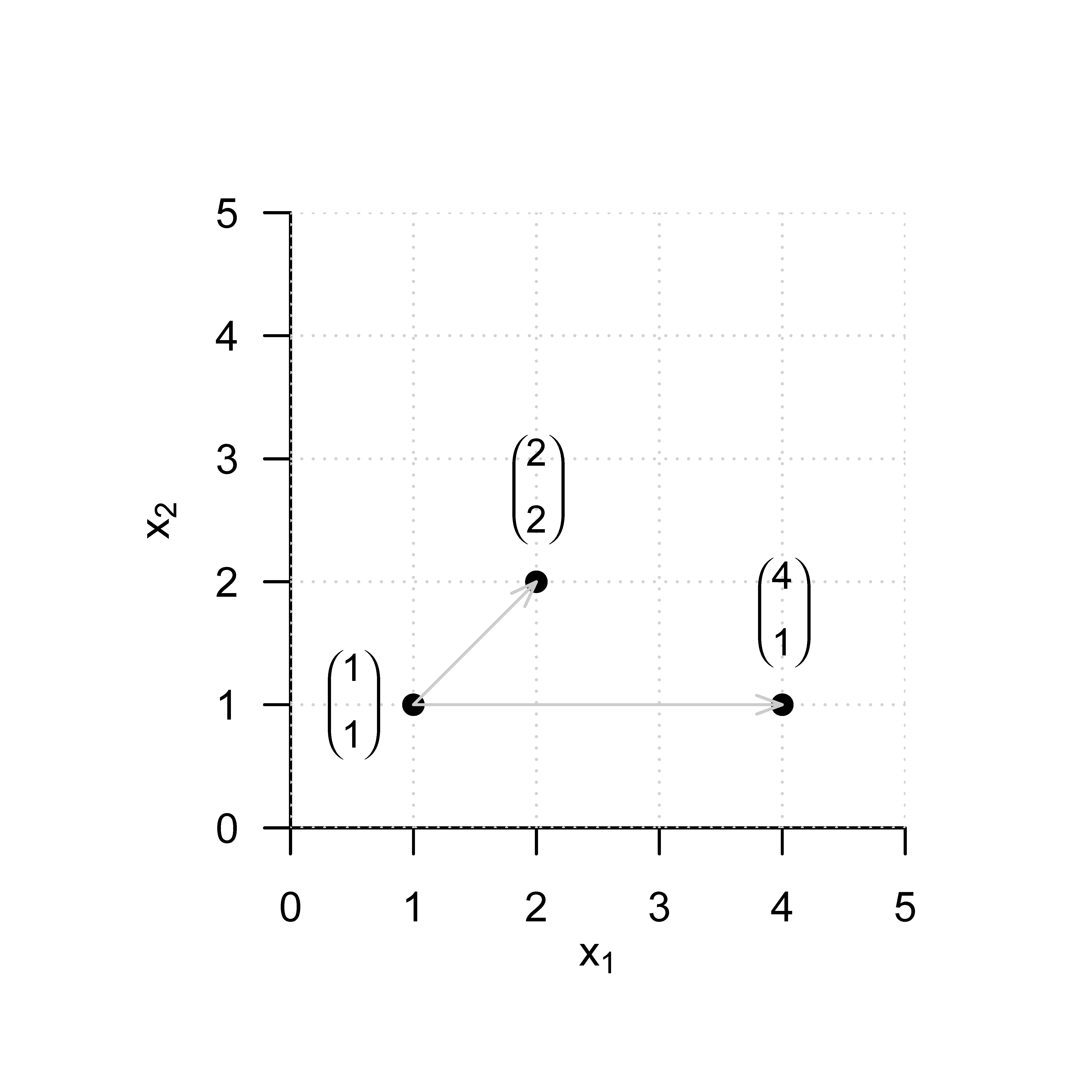 \[\begin{equation} d\left(\begin{pmatrix} 1 \\ 1 \end{pmatrix}, \begin{pmatrix} 2 \\ 2 \end{pmatrix}\right) = \left\lVert \begin{pmatrix} 1 \\ 1 \end{pmatrix} - \begin{pmatrix} 2 \\ 2 \end{pmatrix} \right\rVert = \left\lVert \begin{pmatrix} -1 \\ -1 \end{pmatrix} \right\rVert = \sqrt{(-1)^2 + (-1)^2} = \sqrt{2} \approx 1.41 \end{equation}\]