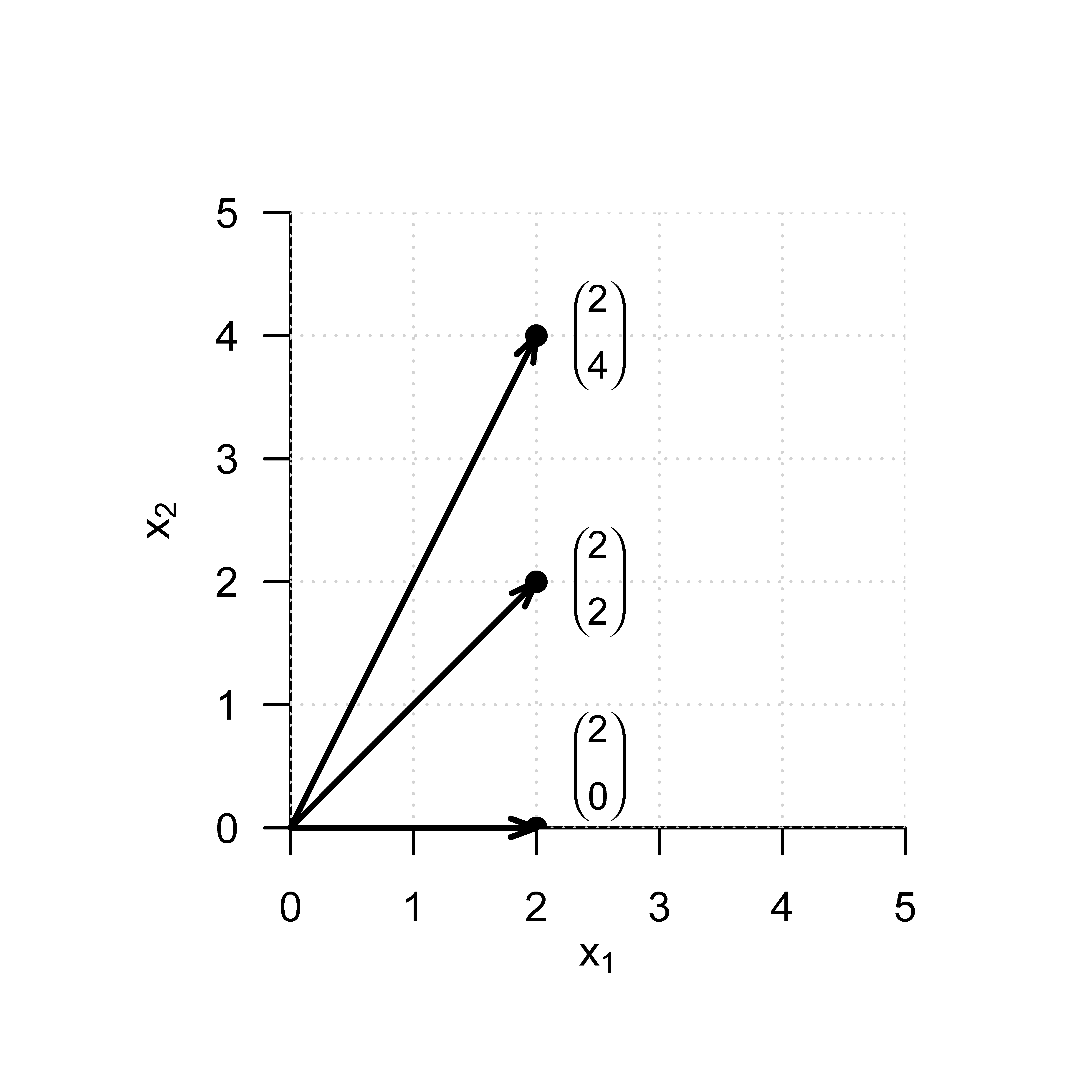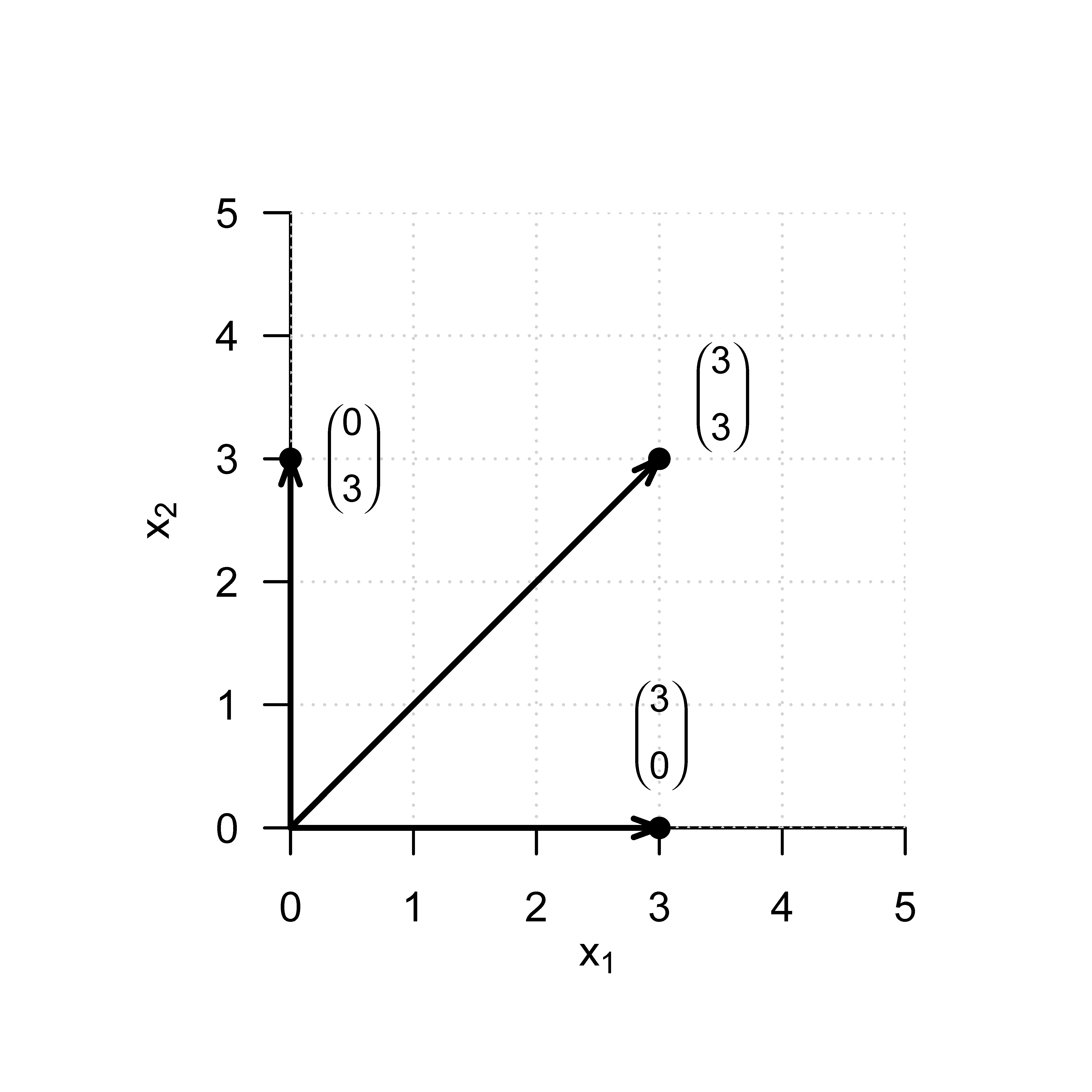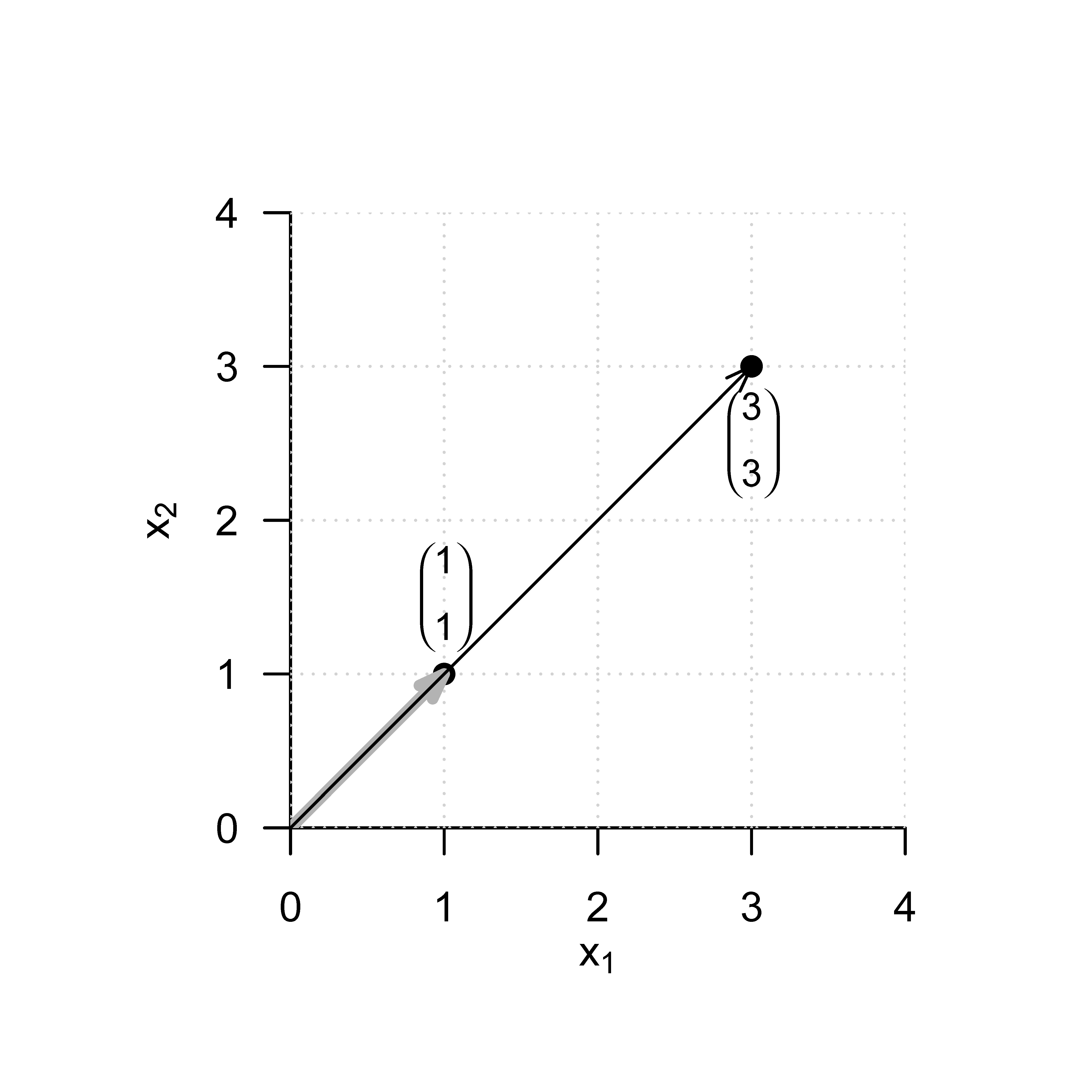 Abbildung 8.4 schließlich visualisiert die Skalarmultiplikation \[\begin{equation} 3 \begin{pmatrix} 1 \\ 1 \end{pmatrix} = \begin{pmatrix} 3 \\ 3 \end{pmatrix} \end{equation}\] Die Multiplikation eines Vektors mit einem Skalar ändert dabei immer nur seine Länge, nicht jedoch seine Richtung.