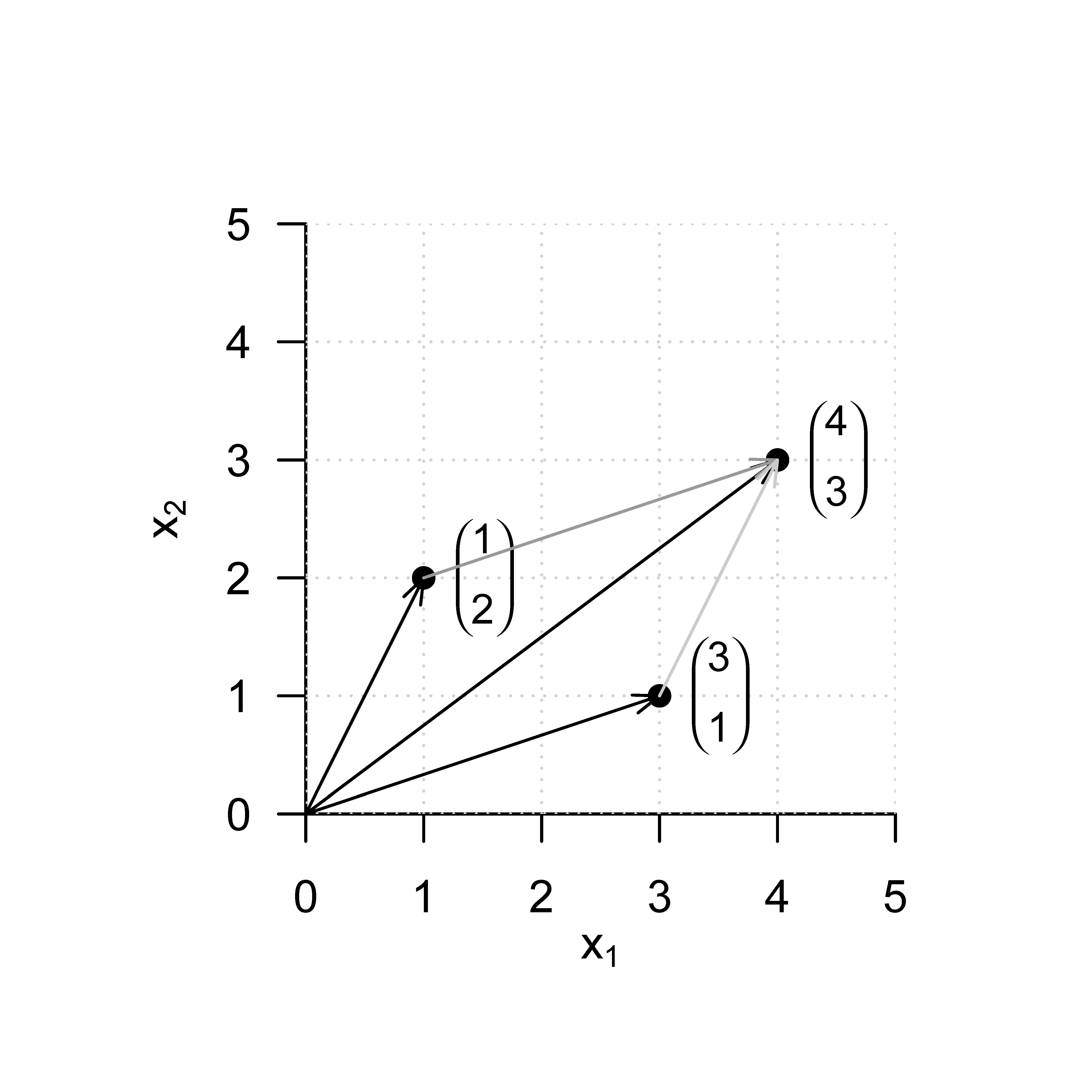 Abbildung 8.2 visualisiert die Vektoraddition \[\begin{equation} \begin{pmatrix} 1 \\ 2 \end{pmatrix} + \begin{pmatrix} 3 \\ 1 \end{pmatrix} = \begin{pmatrix} 4 \\ 3 \end{pmatrix}. \end{equation}\] Der Summenvektor entspricht dabei der Diagonale des von den beiden Summanden aufgespannten Parallelogramms.