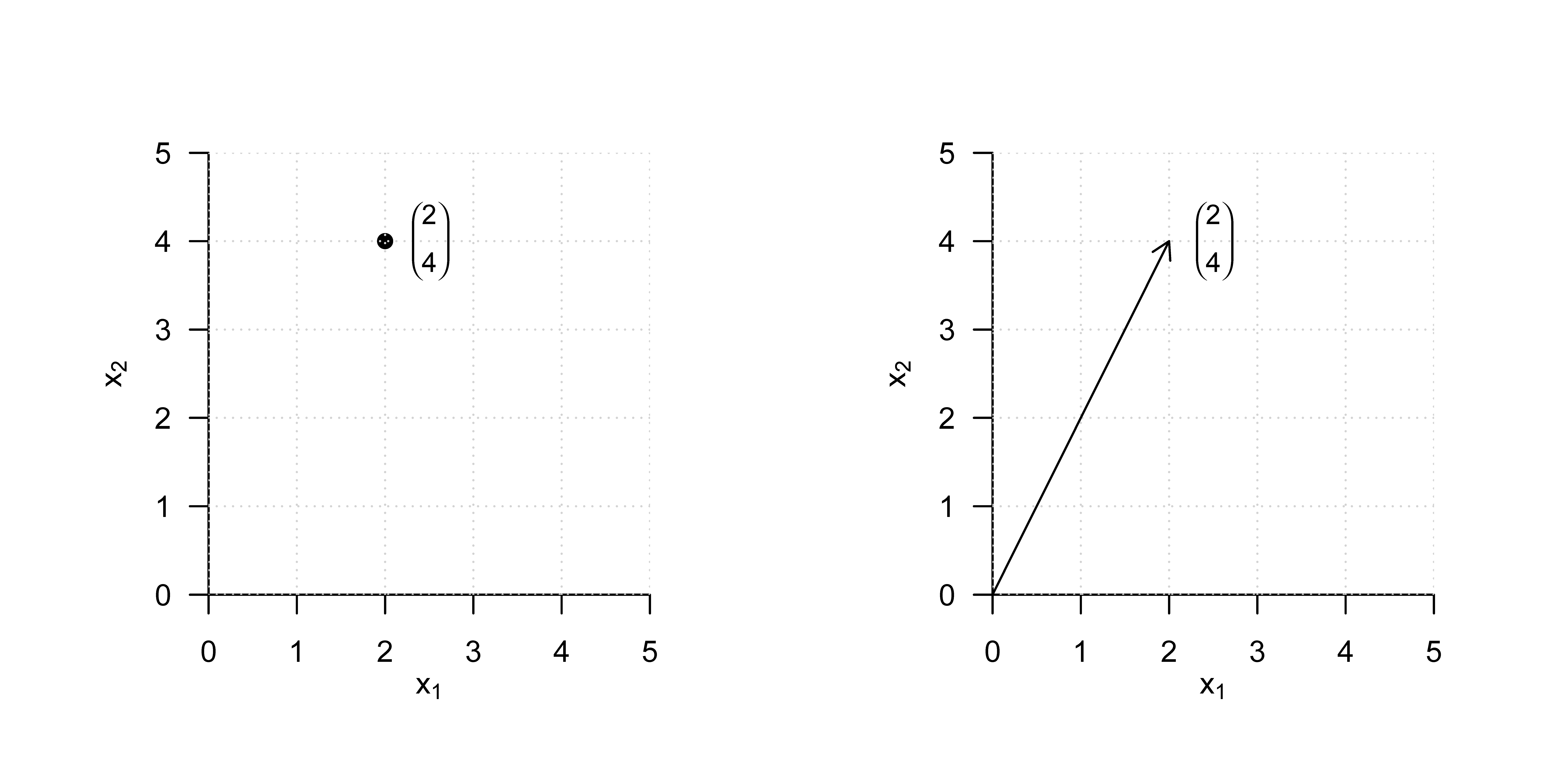 Für \(m \in \{1,2,3\}\) kann man sich reelle Vektoren und das Rechnen mit ihnen visuell veranschaulichen. Für \(m > 3\), wenn also zum Beispiel für eine Person mehr als drei quantitative Merkmale zu ihrem Gesundheitszustand vorliegen, was in der Anwendung regelmäßig der Fall ist, ist dies nicht möglich. Trotzdem mag die visuelle Intuition für \(m \le 3\) einen Einstieg in das Verständnis von Vektorräumen erleichtern. Wir fokussieren hier auf den Fall \(m := 2\). In diesem Fall liegen die betrachteten reellen Vektoren in der zweidimensionalen Ebene und werden üblicherweise als Punkte oder Pfeile visualisiert (Abbildung 8.1).