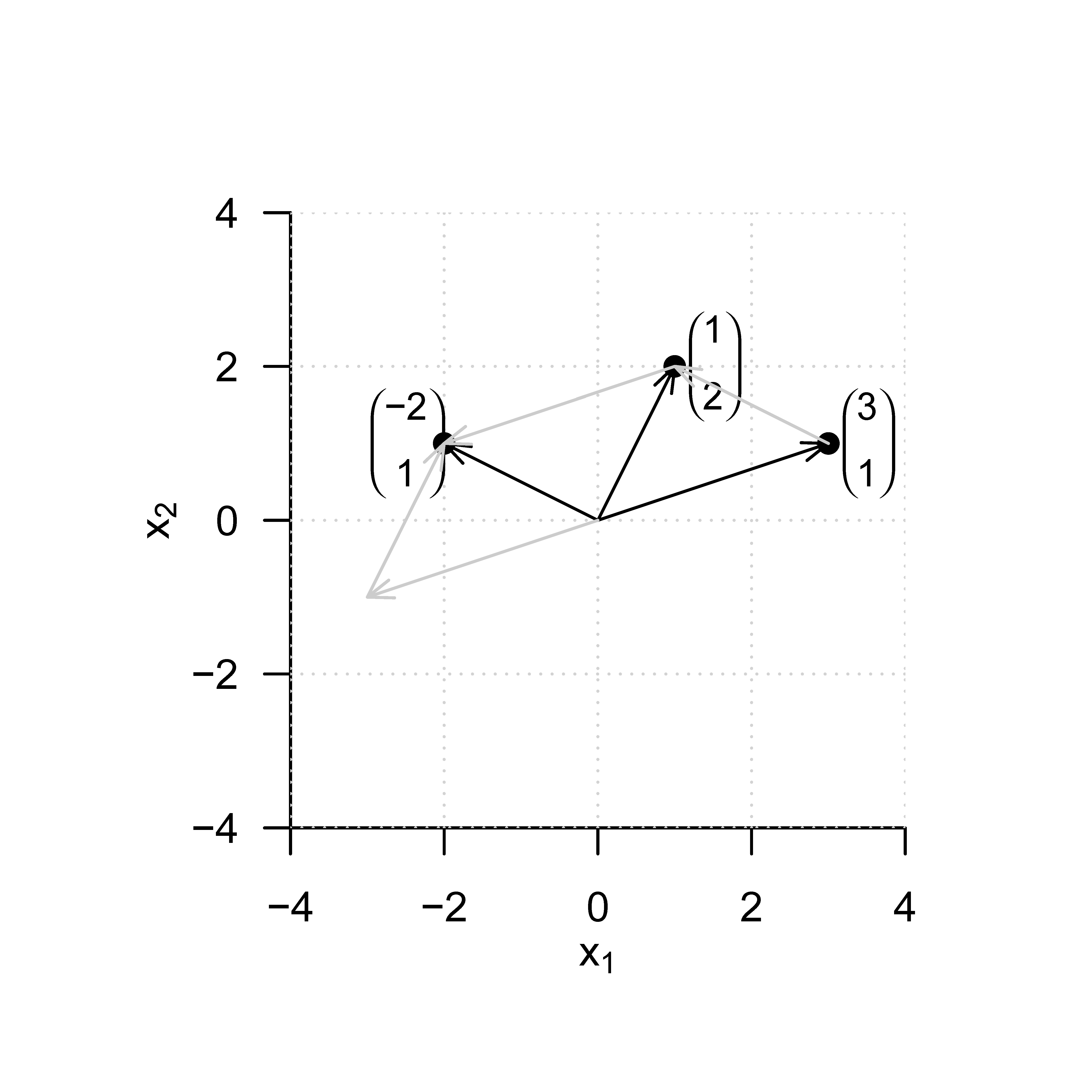 Abbildung 8.3 visualisiert die Vektorsubtraktion \[\begin{equation} \begin{pmatrix} 1 \\ 2 \end{pmatrix} - \begin{pmatrix} 3 \\ 1 \end{pmatrix} = \begin{pmatrix} 1 \\ 2 \end{pmatrix} + \begin{pmatrix} -3 \\ -1 \end{pmatrix} = \begin{pmatrix} -2 \\ \,\, 1 \end{pmatrix} \end{equation}\] Der resultierende Vektor entspricht dabei der Diagonale des von dem ersten Vektors und dem entgegensetzten Vektor des zweiten Vektors aufgespannten Parallelogramms.