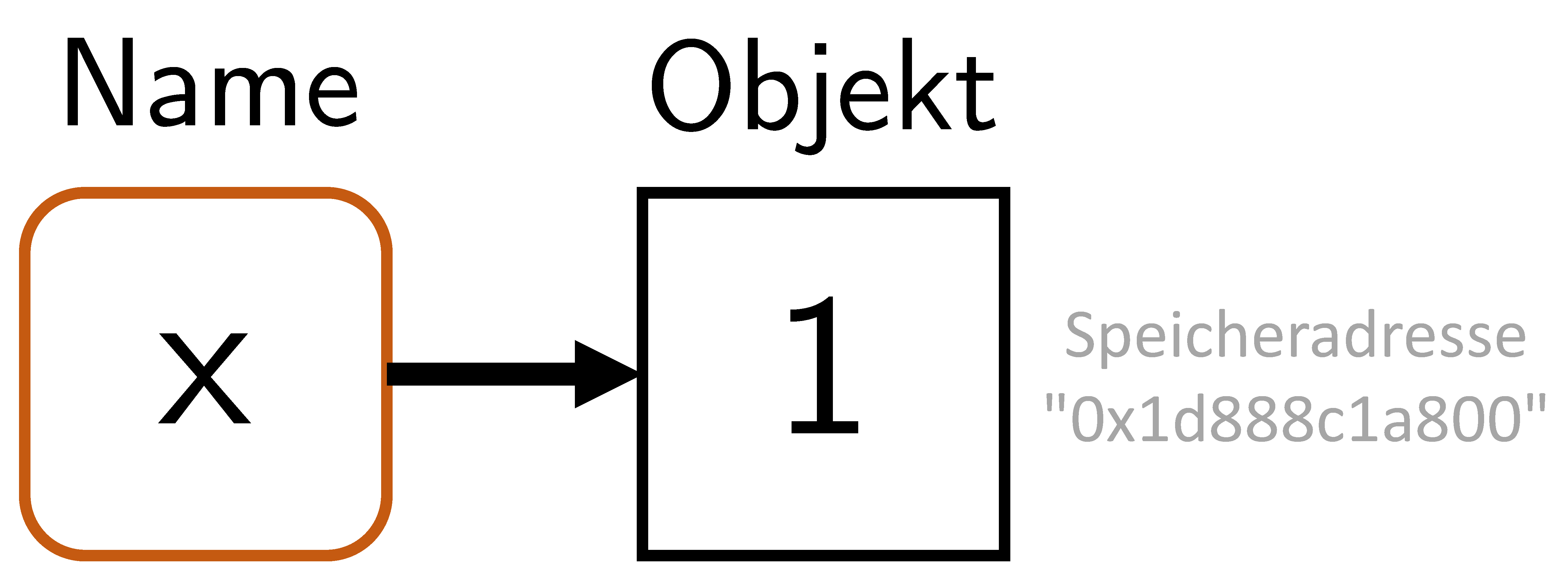 Wir wollen uns noch etwas genauer mit dem Verhältnis von Variablennamen (Bezeichnern) und Variableninhalten (Objekten im Arbeitsspeicher) befassen. Die folgenden Begriffe und Zusammenhänge sind insbesondere dann wichtig, wenn Berechnungen an die Grenzen des verfügbaren Arbeitsspeichers gelangen und optimiert werden müssen.