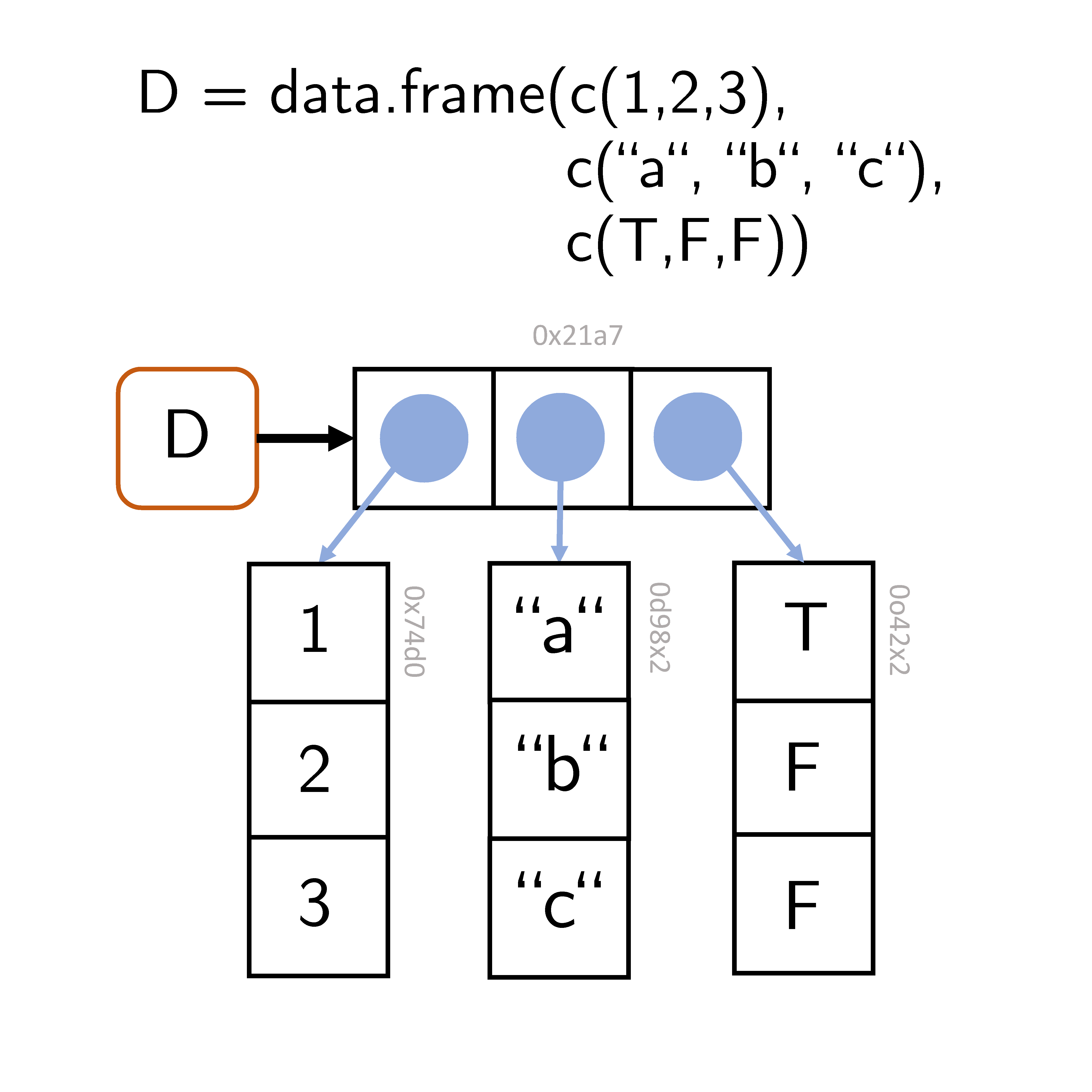 Abbildung 16.3: Dataframerepräsentation. Ein R Dataframe ist einer R Liste deren Elemente R Vektoren gleicher Länge sind.