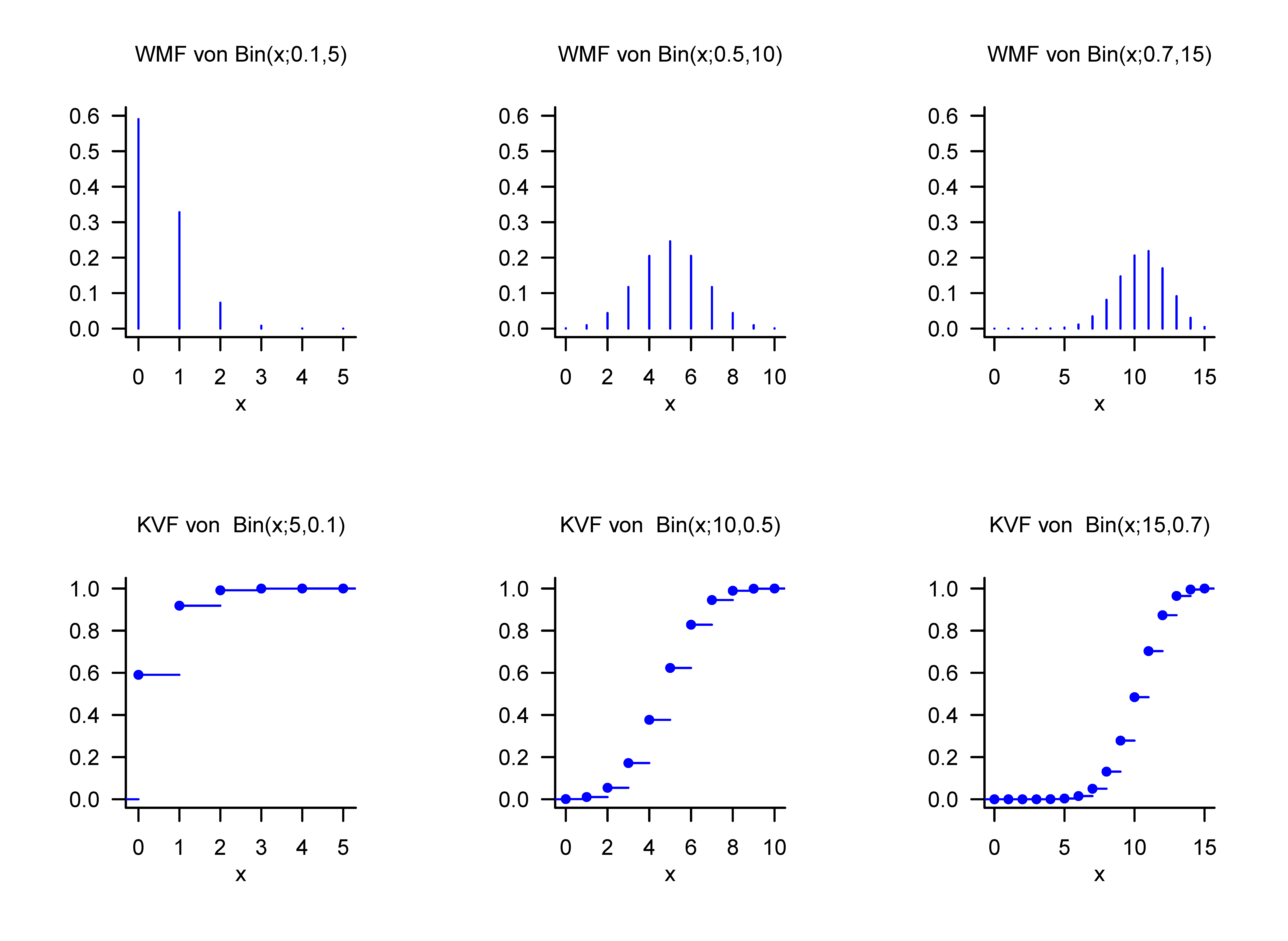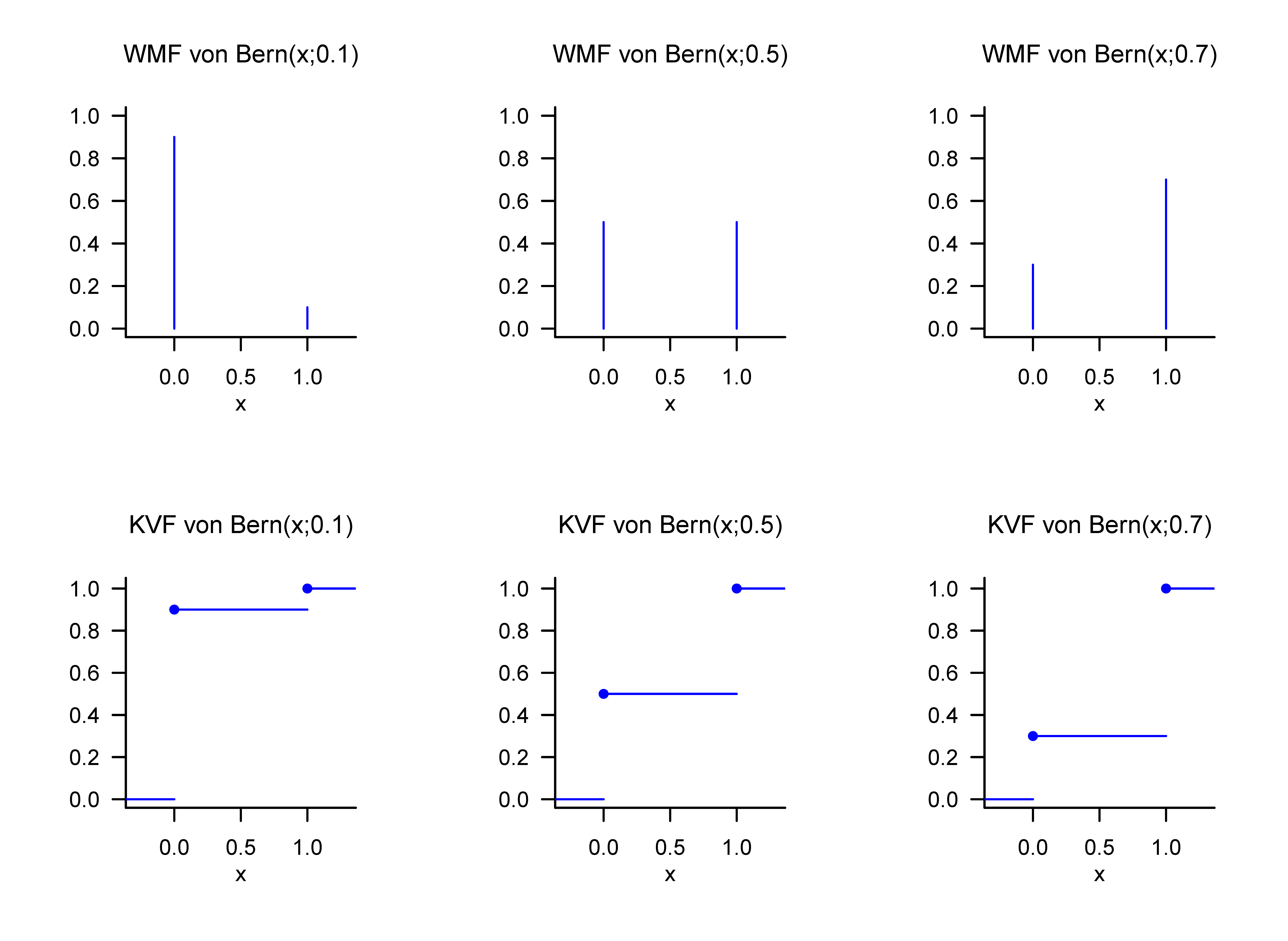 Wir wollen mit den Bernoulli-Zufallsvariablen, den Binomial-Zufallsvariablen und den Diskrete-gleichverteilten Zufallsvariablen drei erste Beispiel für die Definition von Verteilungen mithilfe von WMFen betrachten.