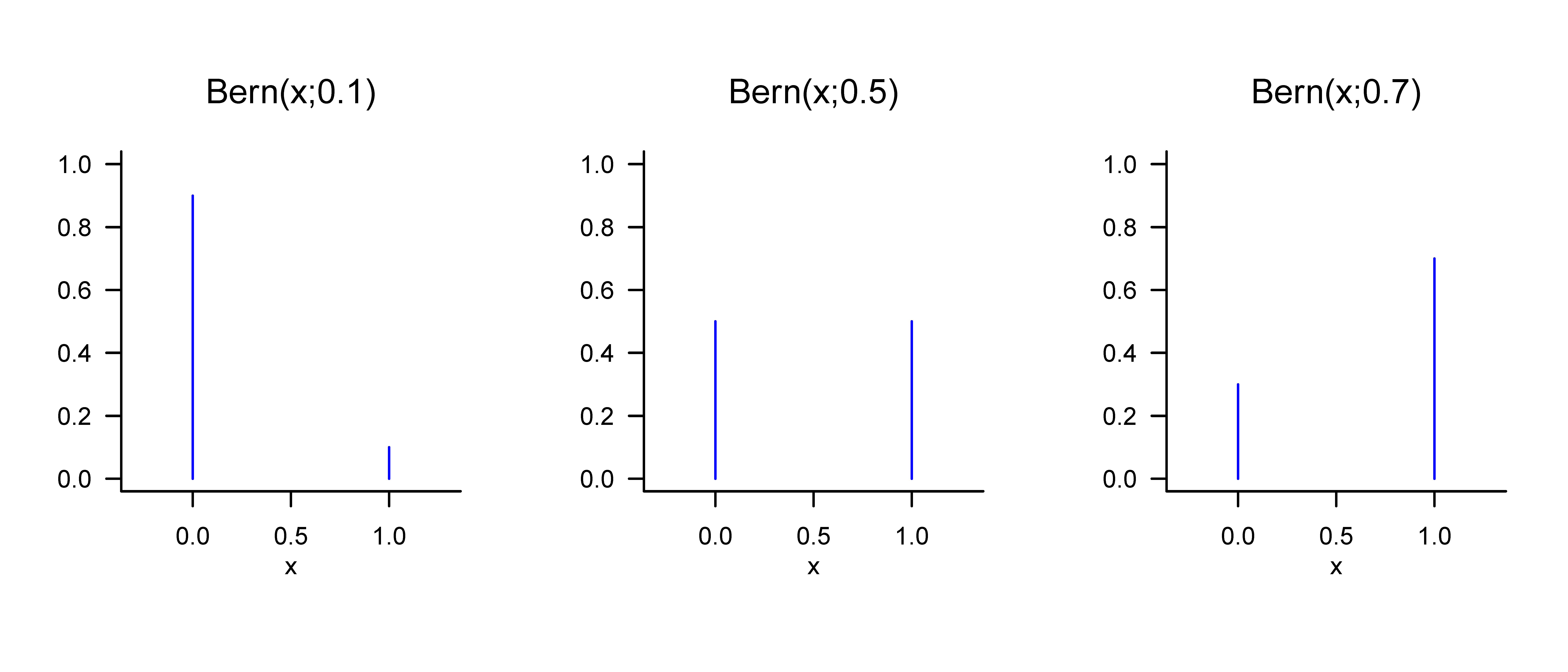 Wir visualisieren die WMFen von Bernoulli-Zufallsvariablen für \(\mu := 0.1, \mu := 0.5\) und \(\mu := 0.7\) in Abbildung 21.3.