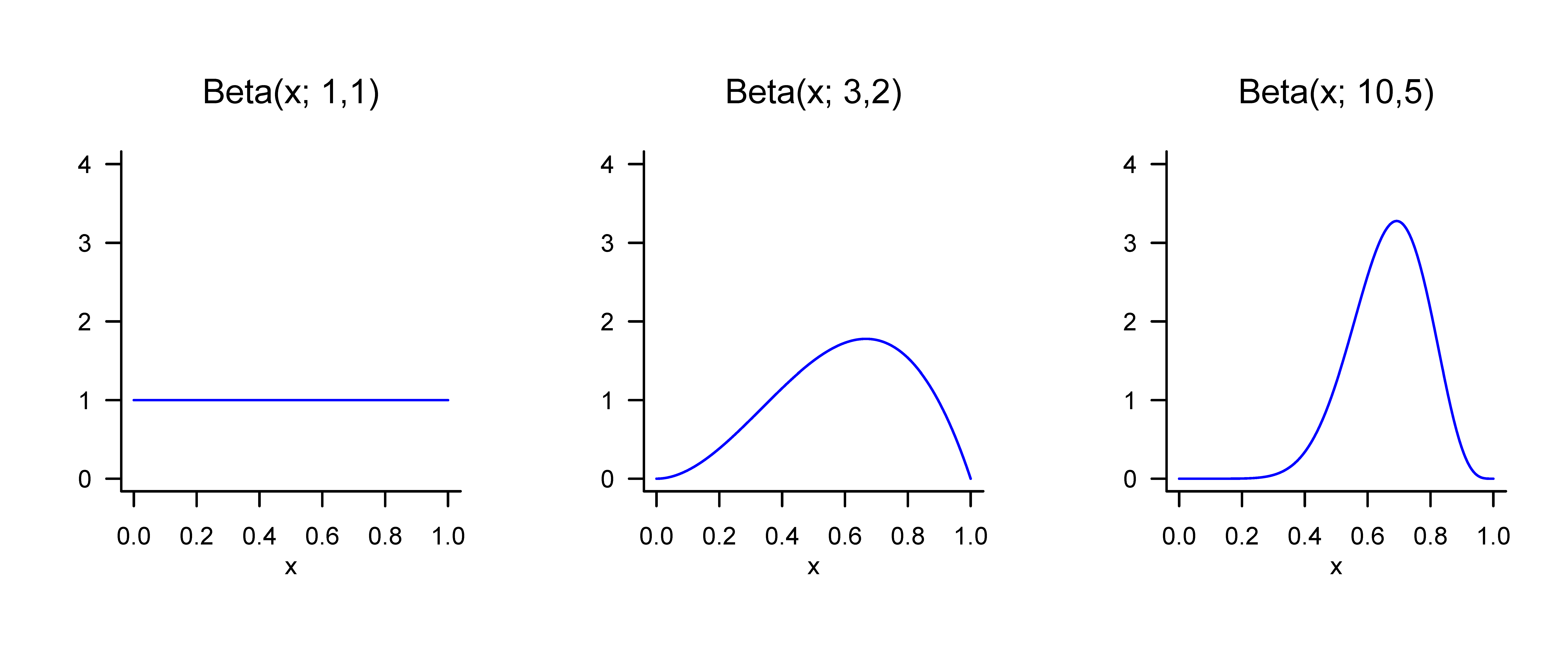 Dadurch, dass der Ergebnisraum einer Beta-Zufallsvariable auf das Intervall \(\mathcal{X} := [0,1]\) (für \(\alpha < 1, \beta < 1\) genauer \(\mathcal{X} := ]0,1[\)) beschränkt ist, bietet sich eine Beta-Zufallsvariable unter anderem dafür an, Wahrscheinlichkeiten von Wahrscheinlichkeiten (also Werten zwischen 0 und 1) zu beschreiben. Wir visualisieren die WDFen von Beta-Zufallsvariablen für \((\alpha,\beta) := (1,1), (\alpha,\beta) := (3,2)\) und \((\alpha,\beta) := (10,5)\) in Abbildung 21.8.