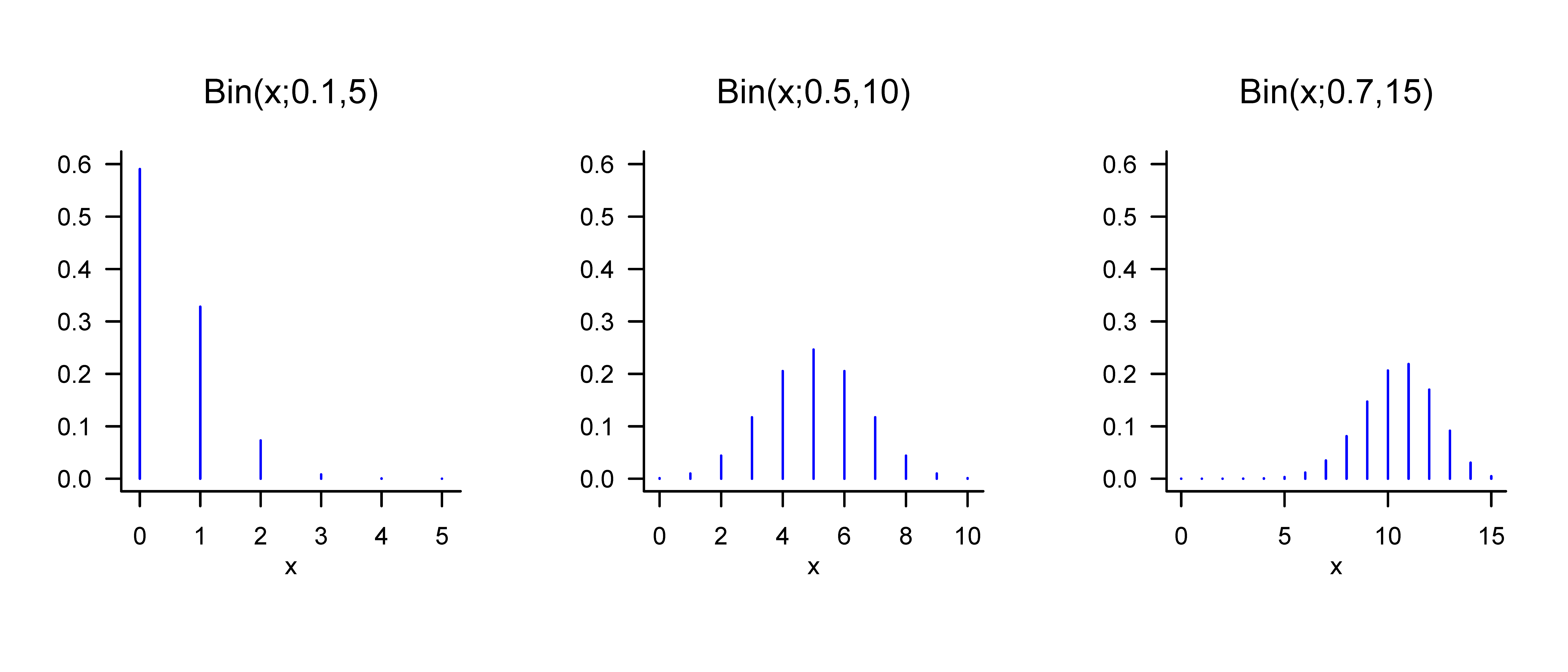 Ohne Beweis halten wir fest, dass eine Binomial-Zufallsvariable als Modell der Summe von \(n\) unabhängig und identisch verteilten Bernoulli-Zufallsvariablen genutzt werden kann. Insbesondere gilt also \(\mbox{Bin}(x;\mu,1) = \mbox{Bern}(x;\mu)\). Binomial-Zufallsvariablen haben die Eigenschaft, dass mit \(n\) einer ihrer Parameter nicht nur die funktionale Form ihrer WMF, sondern auch ihren Ergebnisraum \(\mathcal{X}\) festlegt. Wir visualisieren die WMFen von Binomial-Zufallsvariablen für \((\mu,n) := (0.1,5), (\mu,n) := (0.5,10)\) und \((\mu,n) := (0.7,15)\) in Abbildung 21.4.