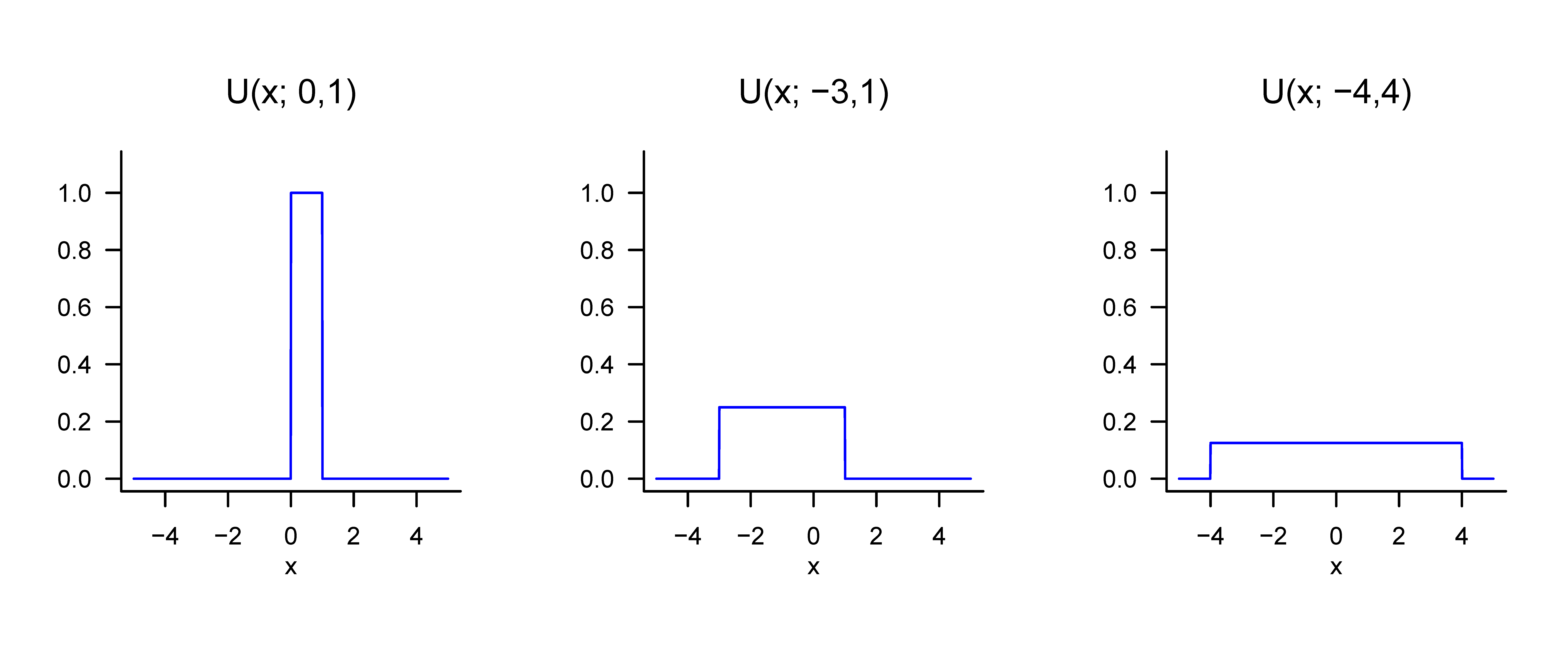 Wir visualisieren die WDFen von gleichverteilten Zufallsvariablen für \((a,b) := (0,1)\), \((a,b) := (-3,1)\) und \((a,b) := (-4,4)\) in Abbildung 21.9.
