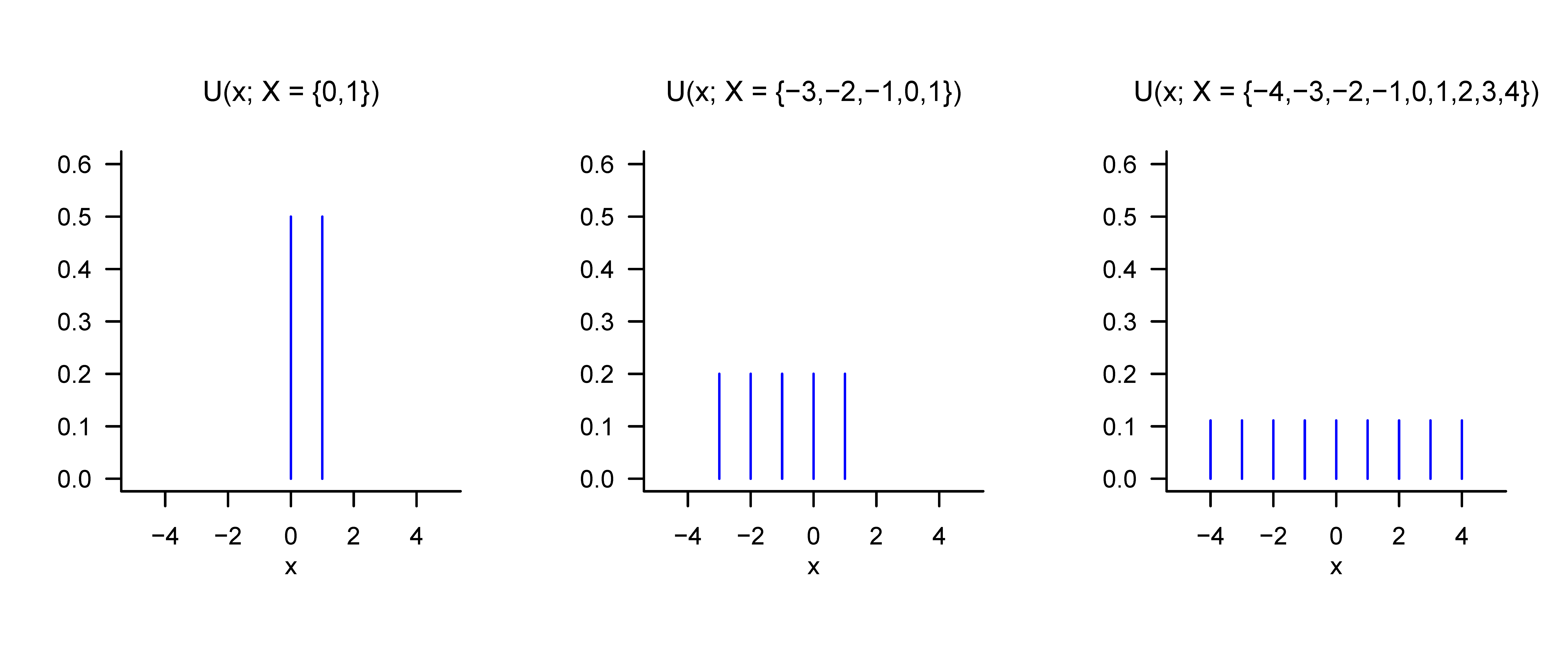 Diskrete-gleichverteilte Zufallsvariable können offenbar immer dann zur probabilistischen Modellierung genutzt werden, wenn die möglichen diskreten Ergebnisse des modellierten Phänomenens die gleiche Wahrscheinlichkeit haben. Im Fall der diskret-gleichverteilten Zufallsvariablen braucht es zur Definition ihrer funktionalen Form nach Festlegung des Ergebnisraums keinen weiteren Parameter. Offenbar gilt für \(\mathcal{X} := \{0,1\}\) \[\begin{equation} U(x;|\mathcal{X}|) = \mbox{Bern}(x;0.5) = \mbox{Bin}(x;1,0.5) \end{equation}\] Wir visualisieren die WMFen von diskret-gleichverteilten Zufallsvariablen für \(\mathcal{X} := \{\{0,1\}\), \(\mathcal{X} := \{-3,-2,-1,0,1\}\}\) und \(\mathcal{X} := \{-4,-3,-2,-1,0,1,2,3,4\}\) in Abbildung 21.5. Man beachte, dass Definition 21.7 formal die Sequentialität der Elemente von \(\mathcal{X}\) nicht erfordert, man kann also genauso eine diskret-gleichverteilte Zufallsvariable mit Ergebnisraum \(\mathcal{X} := \{1,5,7\}\) oder auch nicht numerischen Ergebnisraum \(\mathcal{X} := \{a,b,x,y\}\) definieren.