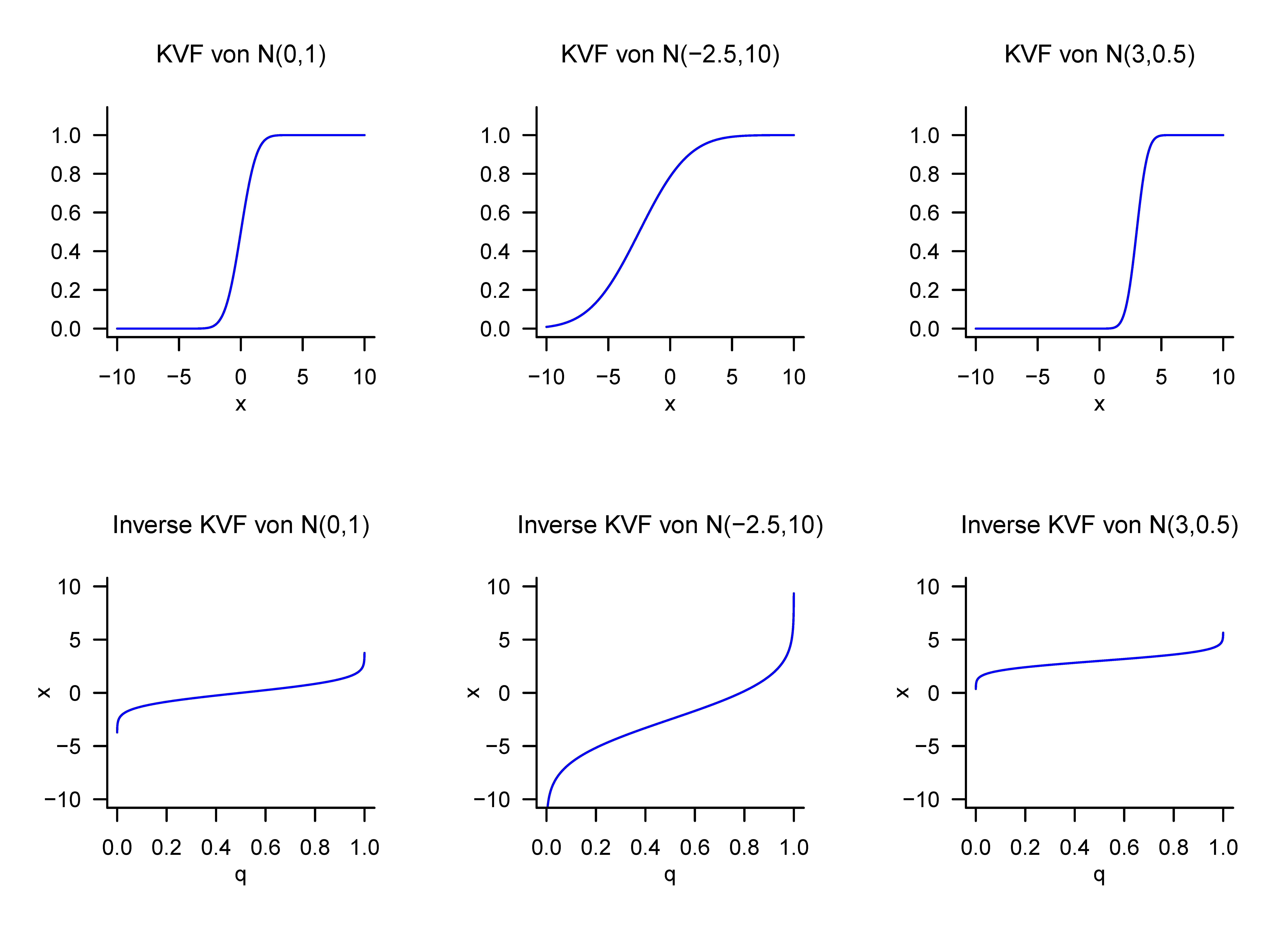 Definition 21.14 (Inverse Kumulative Verteilungsfunktion) \(\xi\) sei eine kontinuierliche Zufallsvariable mit KVF \(P\). Dann heißt die Funktion \[\begin{equation} P^{-1} : ]0,1[ \to \mathbb{R}, q \mapsto P^{-1}(q) := \{x \in \mathbb{R}|P(x) = q\} \end{equation}\] die inverse kumulative Verteilungsfunktion von \(\xi\).