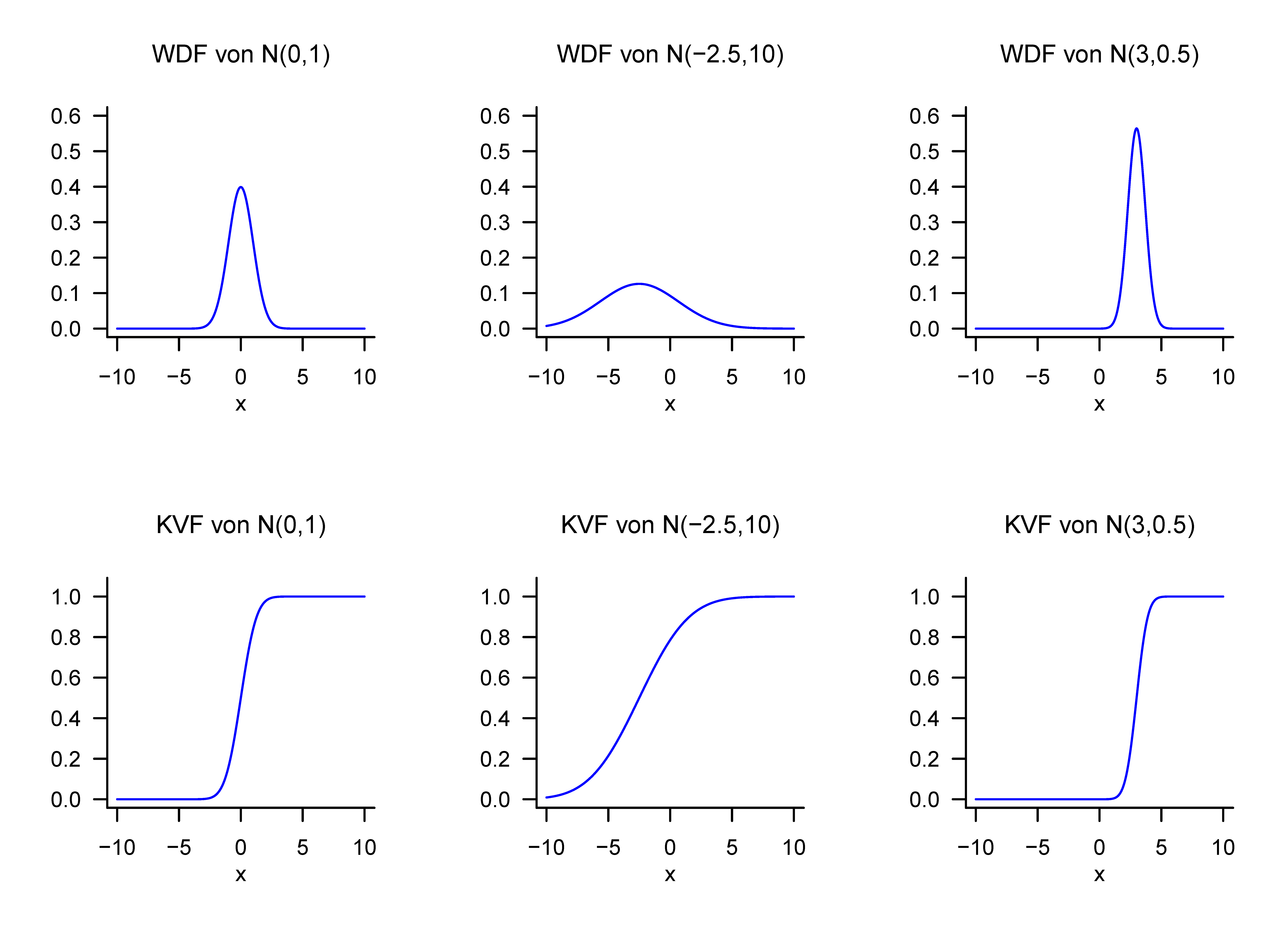Als Beispiel betrachten wir die KVF einer normalverteilten Zufallsvariable. Es sei \(\xi \sim N(\mu,\sigma^2)\). Dann ist die WDF von \(\xi\) bekanntlich durch \[\begin{equation} p : \mathbb{R} \to \mathbb{R}_{>0}, x \mapsto p(x) := \frac{1}{\sqrt{2\pi\sigma^2}}\exp\left(-\frac{1}{2\sigma^2}(x-\mu)^2\right). \end{equation}\] gegeben. Für die KVF von \(\xi\) folgt entsprechend, dass \[\begin{equation} P : \mathbb{R} \to ]0,1[, x \mapsto P(x) = \frac{1}{\sqrt{2\pi\sigma^2}}\int_{-\infty}^x\exp\left(-\frac{1}{2\sigma^2}(s -\mu)^2\right)\,ds. \end{equation}\] Interessanterweise kann das definierende Integral der KVF einer normalverteilten Zufallsvariable nur numerisch, nicht aber analytisch berechnet werden. Wir visualisieren ausgewählte WDFen und KVFen von normalverteilten Zufallsvariablen in Abbildung 21.12.
