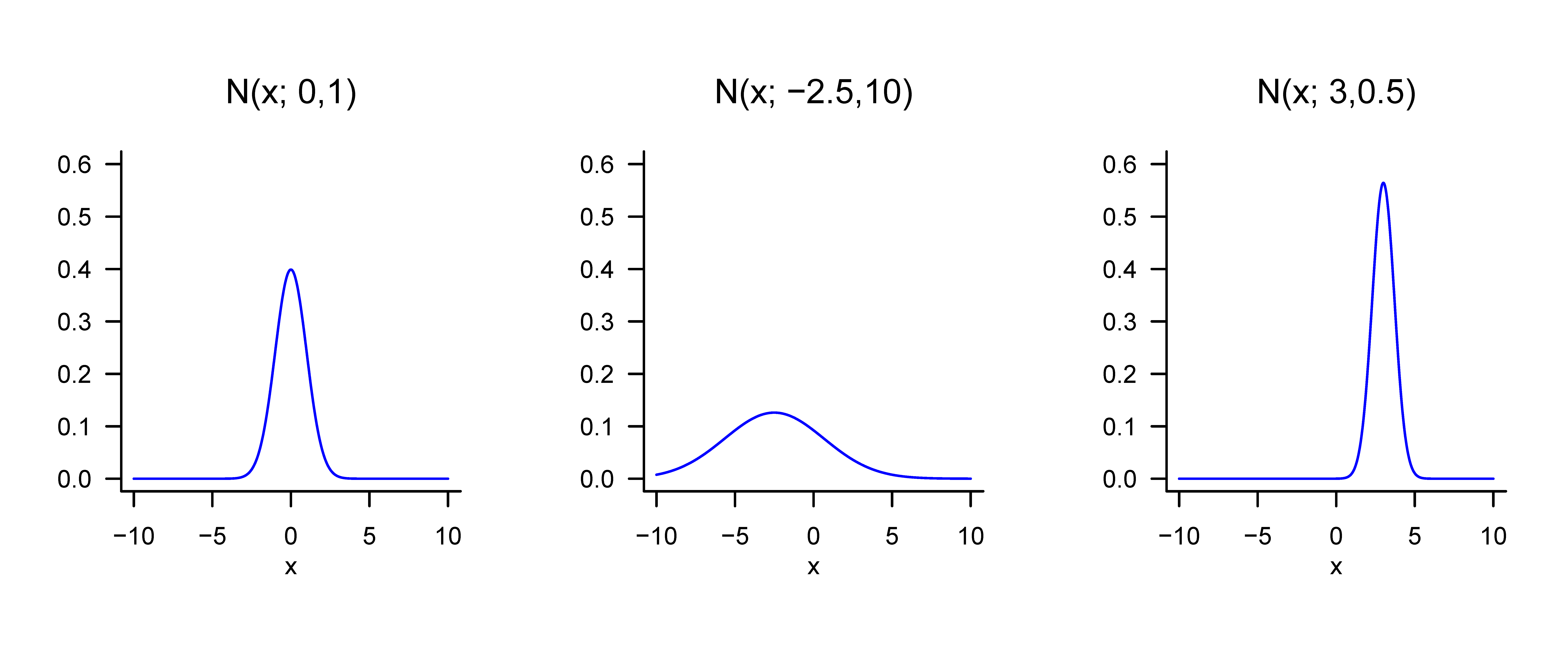 Wir visualisieren die WDFen von normalverteilten Zufallsvariablen für \((\mu,\sigma^2) := (0,1), (\mu,\sigma^2) := (-2.5, 10)\) und \((\mu,\sigma^2) := (3, 0.5)\) in Abbildung 21.6. Man macht sich an dieser Abbildung graphisch klar, dass die WDFen von normalverteilten Zufallsvariablen immer genau einen Werte höchster Wahrscheinlichkeitsdichte haben und zwar an der Stelle des Parameters \(\mu \in \mathbb{R}\). Dies ergibt sich durch die Tatsache, dass das Argument der Exponentialfunktion in der funktionalen Form von \(N(x;\mu,\sigma^2)\) aufgrund des negativen Vorzeichens des Quadrates von \(x-\mu\) und der Positivität von \(\sigma^2\) immer nicht-positiv ist und die Exponentialfunktion auf den nicht-positiven reellen Zahlen ihr Maximum bei \(x = \mu\), also \(x-\mu = 0\) annimmt. Weiterhin macht man sich graphisch klar, dass der Parameter \(\sigma^2>0\) die Breite der WDF einer normalverteilten Zufallsvariable enkodiert.