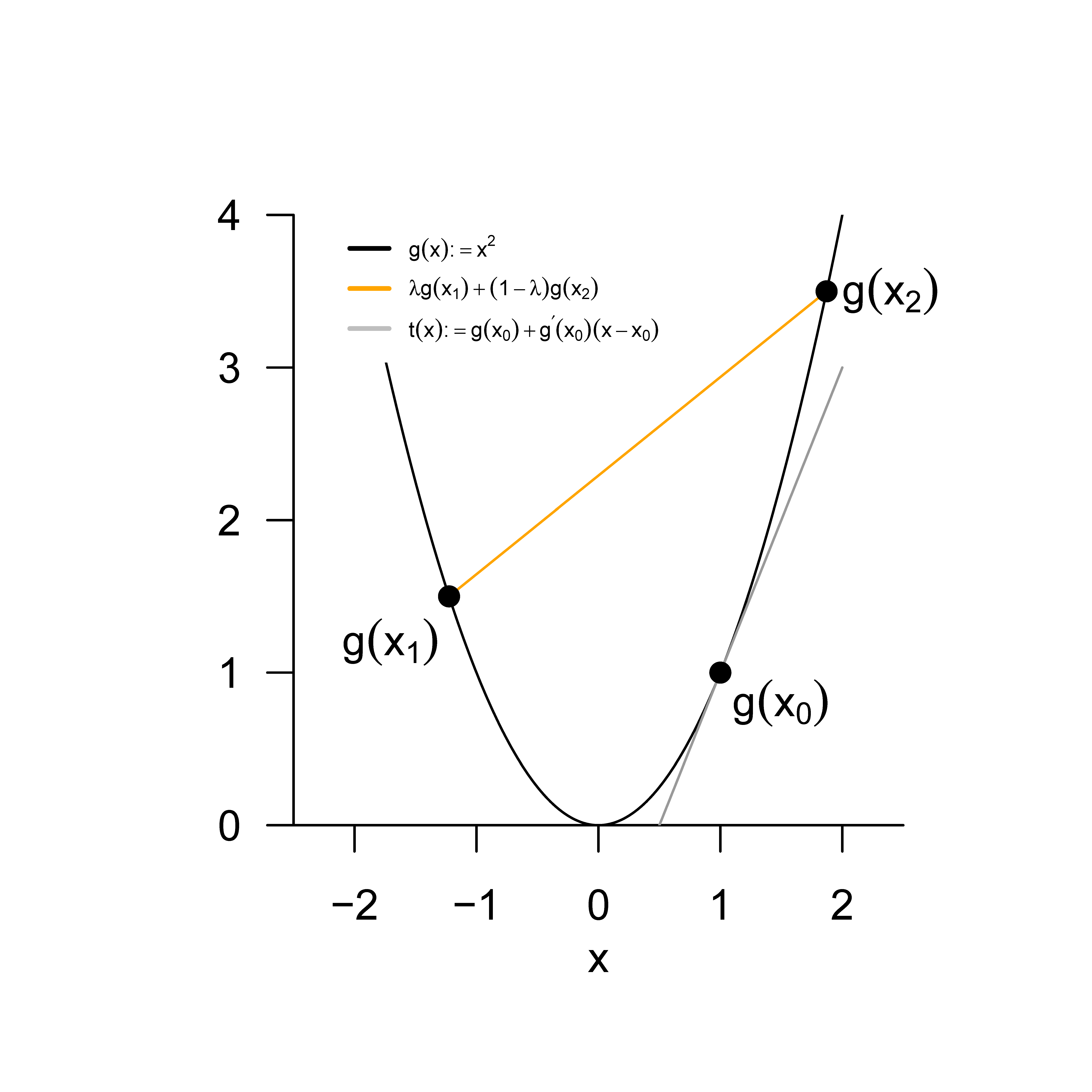 Die Jensensche Ungleichung schließlich liefert Abschätzungen für den Erwartungswert einer durch eine konvexe oder konkave Funktion transformierte Zufallsvariable. Sie kommt in der Betrachtung von Parameterschätzereigenschaften (vgl. Kapitel 37) und insbesondere als Grundlage der Variationalen Bayesianischen Inferenz zum Einsatz. Wir erinnern daran, dass sich eine konvexe Funktion \(g\) dadurch auszeichnet, dass der Funktionsgraph von \(g\) über einem Intervall \([x_1,x_2]\) immer unter der verbindenden Geraden zwischen den Funktionswerten \(g(x_1)\) und \(g(x_2)\) liegt, wohingegehn bei einer konkaven Funktion \(g\) dieser immer über der verbindenden Geraden zwischen den Funktionswerten \(g(x_1)\) zu \(g(x_2)\) liegt. Wir visualisieren dies für eine konvexe Funktion in Abbildung 26.2.