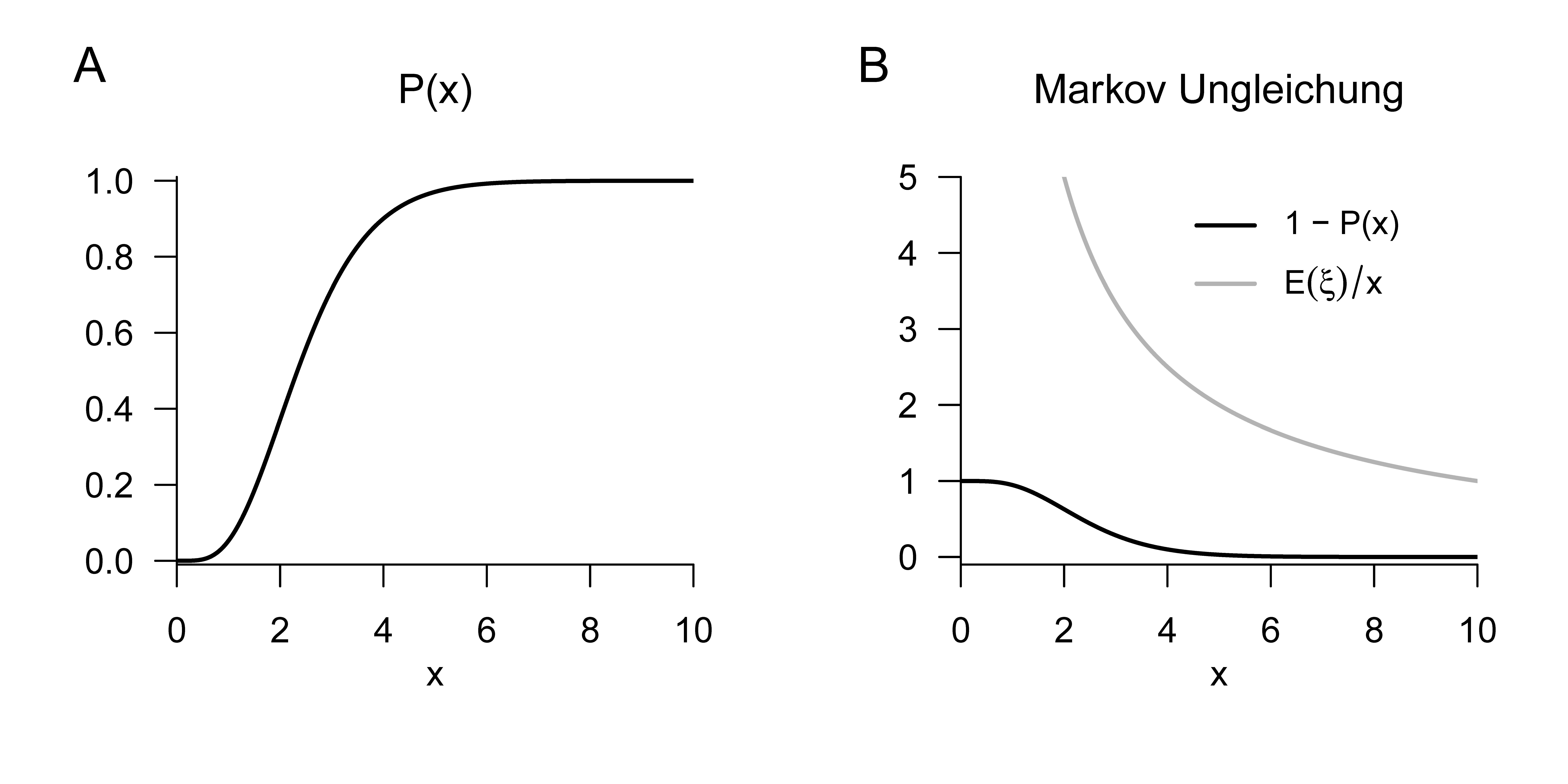 Als Beispiel für die Markov Ungleichung betrachten wir den Fall einer Gamma-Zufallsvariable \(\xi \sim G(\alpha,\beta)\). Gamma-Zufallsvariablen sind bekanntlich per Definition nicht-negativ (vgl. Definition 21.10) und wir haben gesehen, dass für den Erwartungswert einer Gamma-Zufallsvariable \(\mathbb{E}(\xi) = \alpha\beta\) gilt. Wir betrachten konkret den Fall \(\alpha := 5\) und \(\beta := 2\), so dass \(\xi\) auch einer \(\chi^2\)-Zufallsvariable mit Freiheitsgradparameter \(n = 10\) entspricht. In Abbildung 26.1 A stellen wir die KVF \(P\) dieser Zufallsvariable dar, in Abbildung 26.1 B visualisieren wir die in der Markov Ungleichung betrachteten Größen \(\mathbb{E}(\xi)/x\) und die Überschreitungswahrscheinlichkeit \(\mathbb{P}(\xi \ge x) = 1 - P(x)\). Offensichtlich trifft die Markov Ungleichung zu.