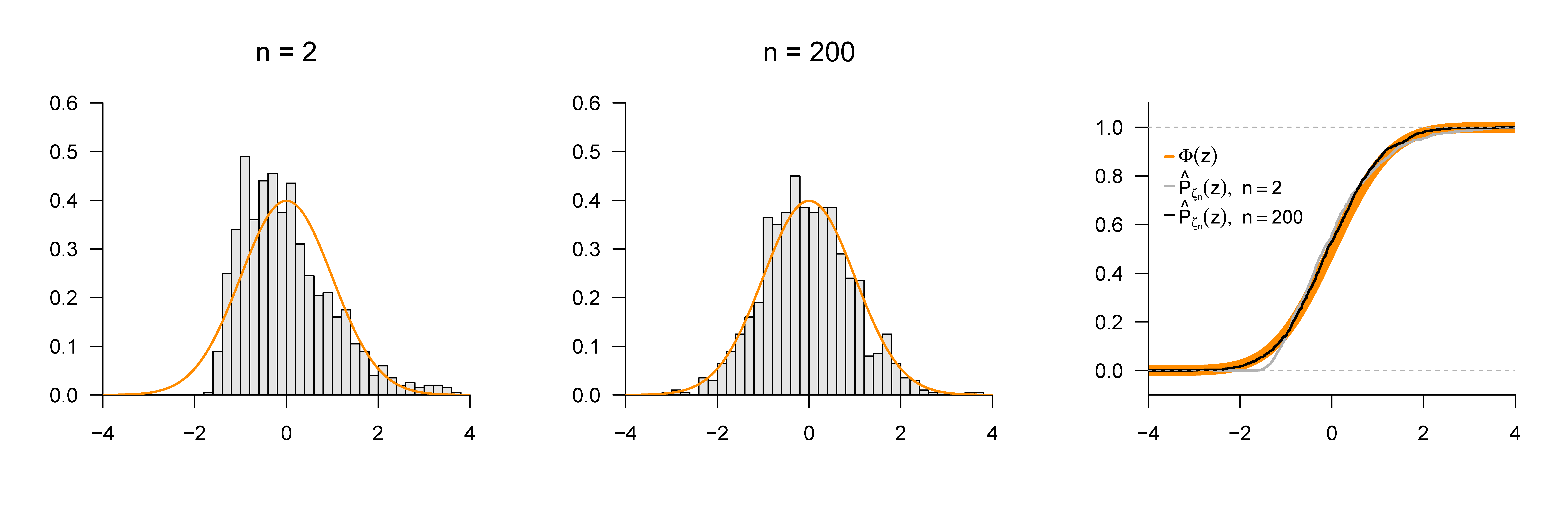 Wir betrachten den Fall von u.i.v. \(\chi^2\)-Zufallsvariablen \(\xi_1,...,\xi_n \sim \chi^2(3)\). Offenbar ist die funktionale Form der \(\chi^2(3)\)-Verteilung von der Standardnormalverteilung recht verschieden, insbesondere nehmen \(\chi^2\)-Zufallsvariablen mit von Null verschiedener Wahrscheinlichkeit nur nicht-negative Werte an (vgl. Kapitel 21.3) Nichtsdestotrotz resultiert ihre standardisierte Summe asymptotisch in einer Normalverteilung, wie in Abbildung 27.2 visualisiert. Dazu nutzen wir auf Ebene der Implementation die Tatsache, für die \(\chi^2\)-Zufallsvariablen \(\xi_i, i = 1,...,n\) mit Freiheitsgradparameter \(3\) bekanntlich gilt (vgl. Kapitel 23 und Kapitel 24) \[\begin{equation} \mathbb{E}(\xi_i) = 3 \mbox{ und }\mathbb{V}(\xi_i) = 6 \end{equation}\] Die Abbildungen in Abbildung 27.2 A zeigen Histogrammschätzer der Wahrscheinlichkeitsdichte von \[\begin{equation} \zeta_n := \sqrt{n}\left(\frac{\bar{\xi}_n - \mu}{\sigma}\right) \end{equation}\] basierend auf 1000 Realisationen von \(\zeta_n\) für \(n = 2\) und \(n = 200\), sowie die WDF von \(N(0,1)\). Offenbar ist die Verteilung der Realisiationen von \(\zeta_2\) der Standardnormalverteilung noch sehr unähnlich, wohingegen sich die Verteilung der Realisationen von \(\zeta_{200}\) der Standardnormalverteilung schon annähert. Abbildung 27.2 B zeigt die entsprechenden geschätzten KVFen über die Theorem 27.2 formal eine Aussage trifft.