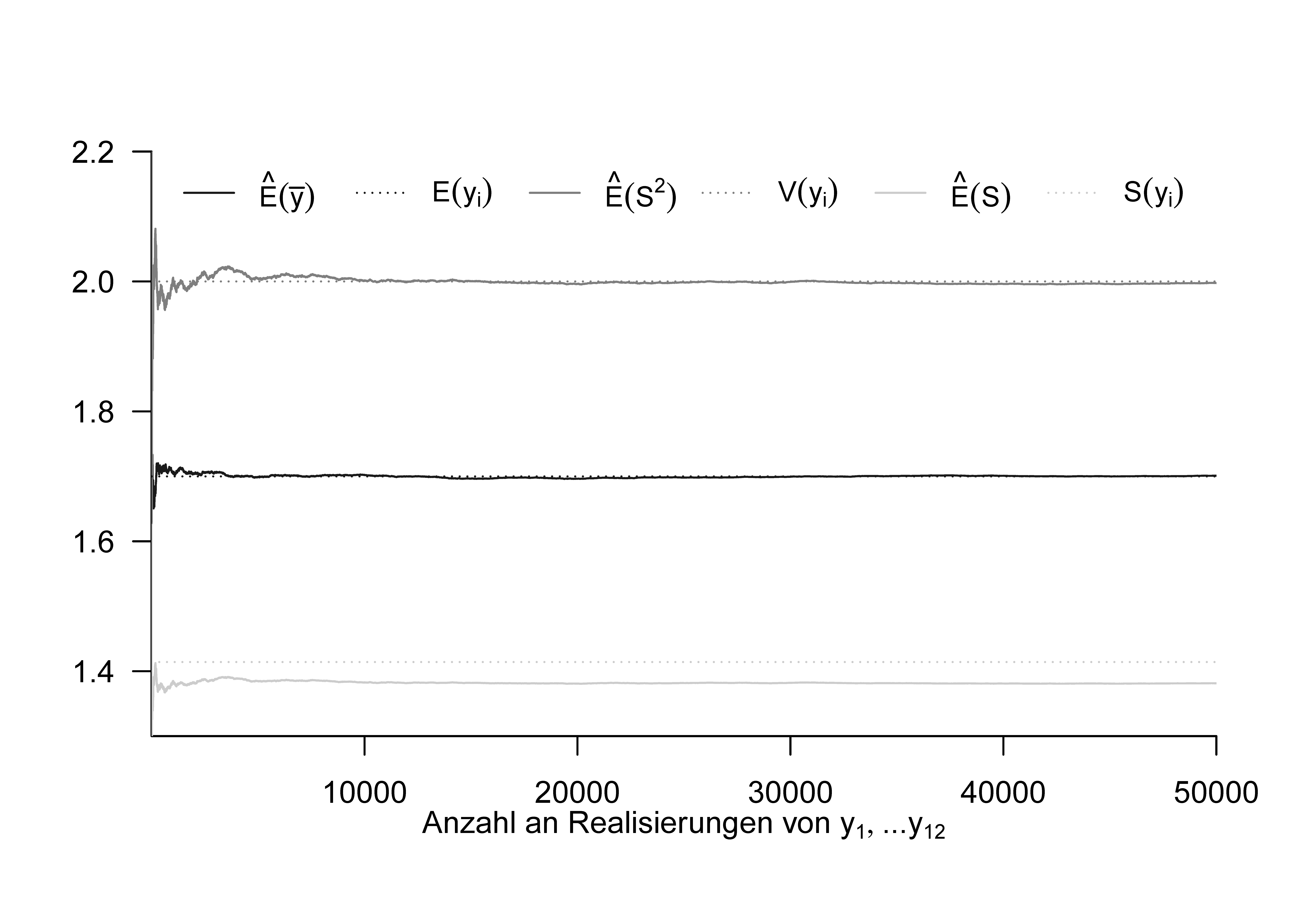In Fortführung von Kapitel 31.2 wollen wir in diesem Abschnitt vier asymptotische Schätzereigenschaften beleuchten. Um zu betonen, dass in diesem Abschnitt die Eigenschaften eines Schätzers \(\hat{\tau}\) vom Stichprobenumfang \(n\) abhängen, schreiben wir in diesem Abschnitt für einen Schätzer \(\hat{\tau}_n\). In Kapitel 31.3.1 betrachten wir die Asymptotische Erwartungstreue eines Schätzers. Dabei heißt ein Schätzer \(\hat{\tau}_n\) für \(\tau\)asymptotisch erwartungstreu, wenn der Erwartungswert von \(\hat{\tau}_n\) für große Stichprobenumfänge \(n \to \infty\) mit dem wahren, aber unbekannten, Wert \(\tau(\theta)\) identisch ist. In Kapitel 31.3.2 führen wir den Begriff der Konsistenz eines Schätzers ein. Intuitiv heißt ein Schätzer \(\hat{\tau}_n\) für \(\tau\)konsistent, wenn für große Stichprobenumfänge \(n \to \infty\) die Wahrscheinlichkeit dafür, dass \(\hat{\tau}_n(y)\) vom wahren, aber unbekannten, Wert \(\tau(\theta)\) abweicht, beliebig klein wird. Für große Stichprobenumfänge resultieren die Verteilungen von Schätzern oft in Normalverteilungen. In Kapitel 31.3.3 führen wir mit dem Begriff der Asymptotischen Normalverteilung eine entsprechende Formalisierung ein. Ein Schätzer \(\hat{\tau}_n\) für \(\tau\) heißt dann asymptotisch normalverteilt, wenn für große Stichprobenumfänge \(n \to \infty\), die Verteilung von \(\hat{\tau}_n\) durch eine Normalverteilung gegeben ist. In Kapitel 31.3.4 schließlich betrachten wir mit der Asymptotischen Effizienz ein Optimalitätskriterium für Schätzer bei gegen unendlich strebenden Stichprobenumfängen mit folgender Bedeutung: ein Schätzer \(\hat{\tau}_n\) für \(\tau\) heißt asymptotisch effizient, wenn für große Stichprobenumfänge \(n \to \infty\) die Verteilung von \(\hat{\tau}_n\) durch eine Normalverteilung mit Erwartungswertparameter \(\tau(\theta)\) und Varianzparameter gleich der Cramér-Rao-Schranke gegeben ist.
