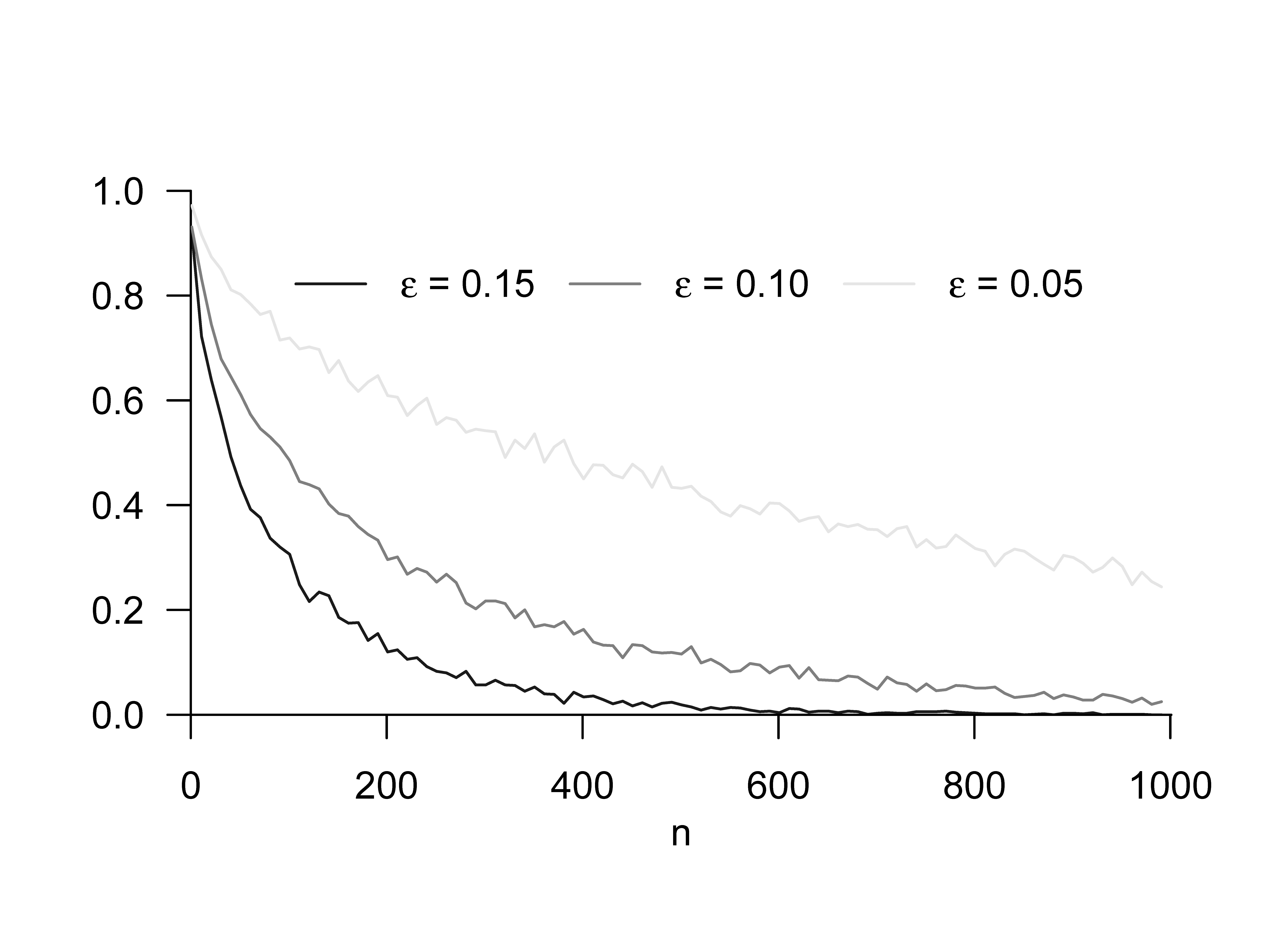 Wir visualisieren die Schätzung der Wahrscheinlichkeit \(\mathbb{P}(|\hat{\tau}_n(y)-\tau(\theta)| \ge \epsilon)\) für dieses Beispiel in Abbildung 31.4 in Abhängigkeit des Stichprobenumfangs und des Kriteriumwerts \(\epsilon\). Bei größeren Werten von \(\epsilon\) genügen geringe Stichprobenumfänge für eine geringe Wahrscheinlichkeit der Abweichung des Schätzers vom wahren, aber unbekannten, Parameterwert, bei kleineren Werten von \(\epsilon\) sind dazu größere Stichprobenumfänge nötig.
