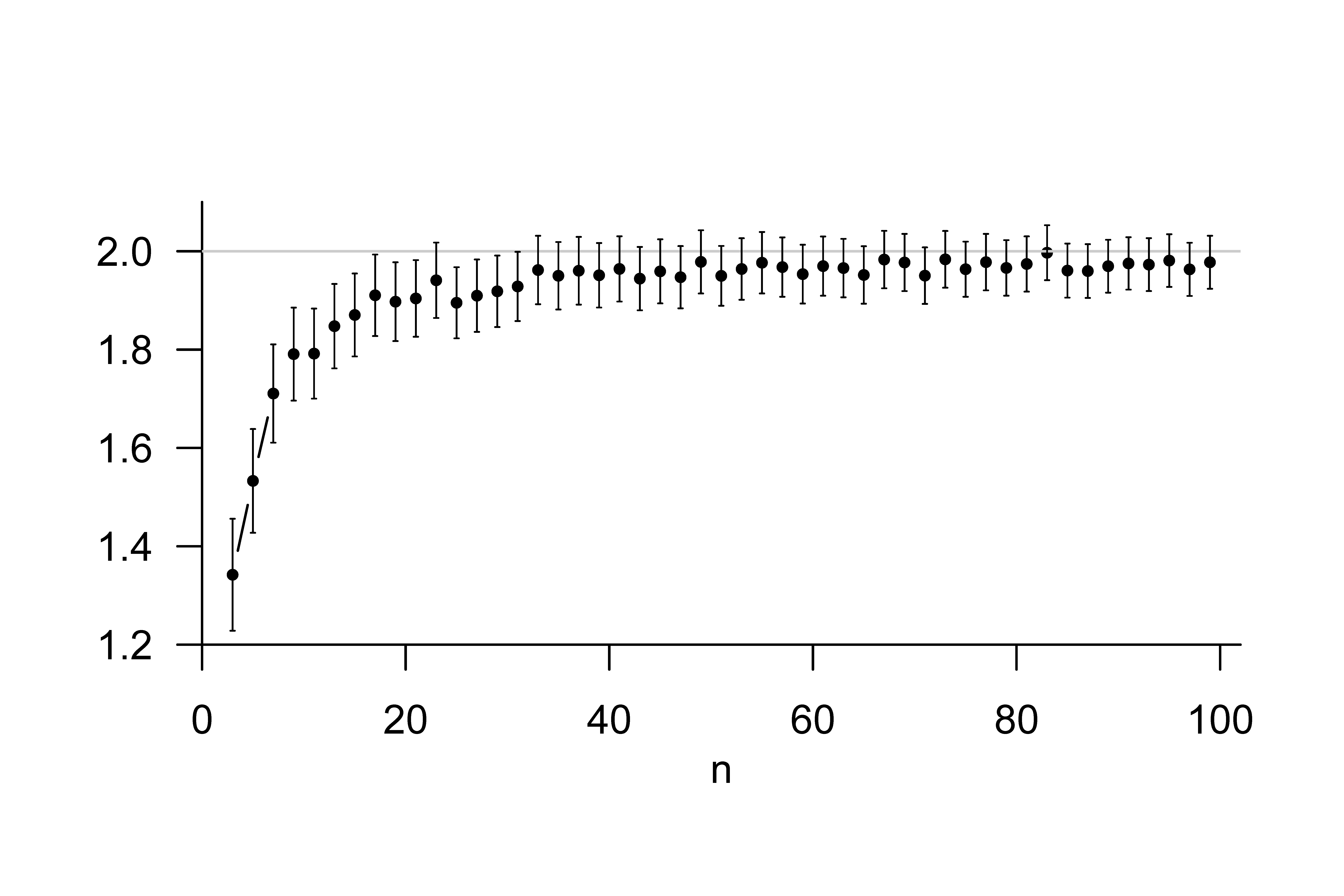 Wir visualisieren den basierend auf obigen Simulationen geschätzten Erwartungswert des Schätzers in Abhängigkeit des Stichprobenumfangs in Abbildung 31.3. Für kleine Stichprobenumfänge unterschätzt der Schätzer den wahren, aber unbekannten, Varianzparameter deutlich, für größere Stichprobenumfänge dagegen nicht.