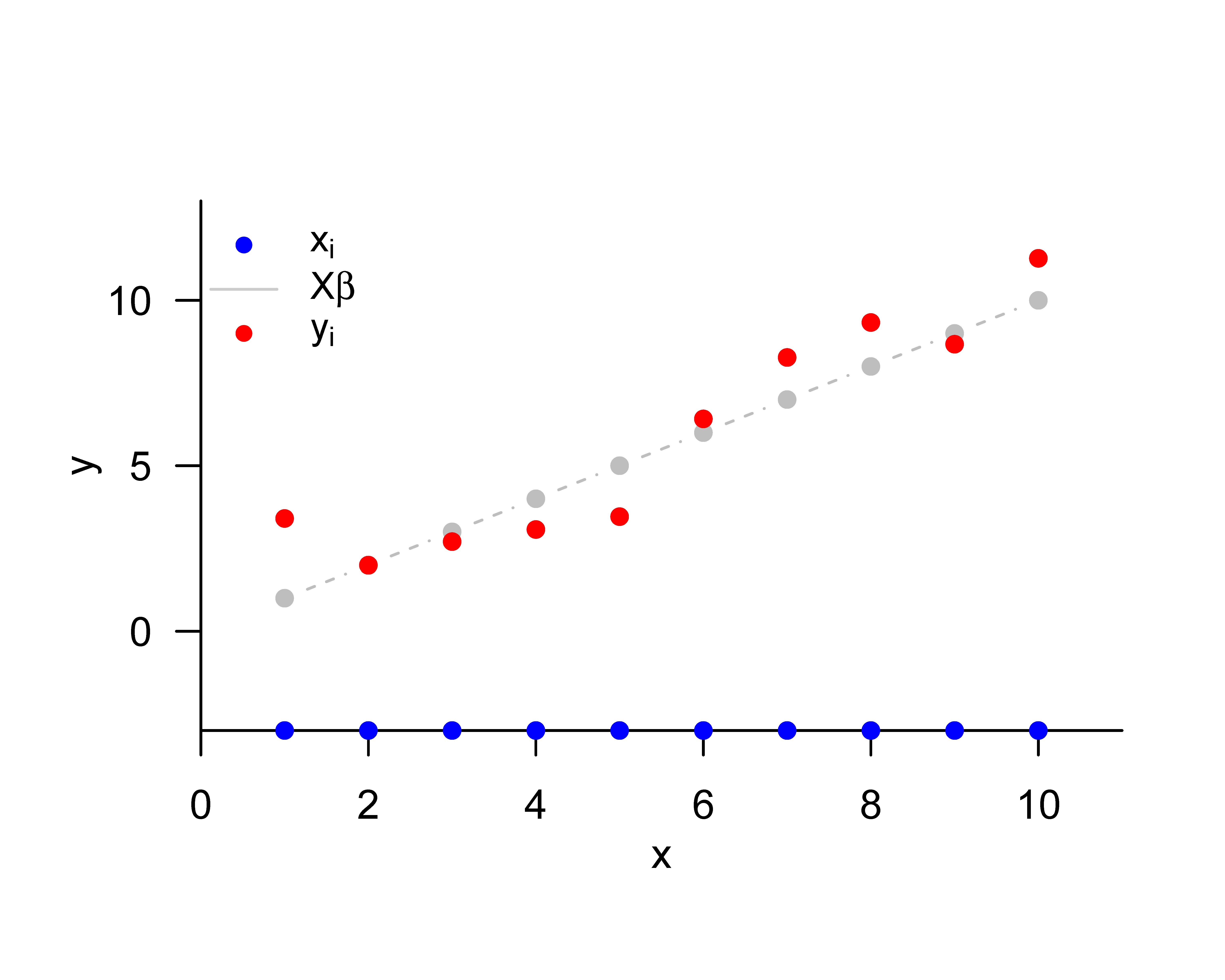 - \(\varepsilon\) ein \(n\)-dimensionaler nicht-beobachtbarer Zufallsvektor ist, der Zufallsfehler genannt wird und für den angenommen wird, dass mit einem unbekannten Varianzparameter \(\sigma^{2}>0\) gilt, dass \[\begin{equation} \varepsilon \sim N\left(0_{n}, \sigma^{2} I_{n}\right) \end{equation}\]