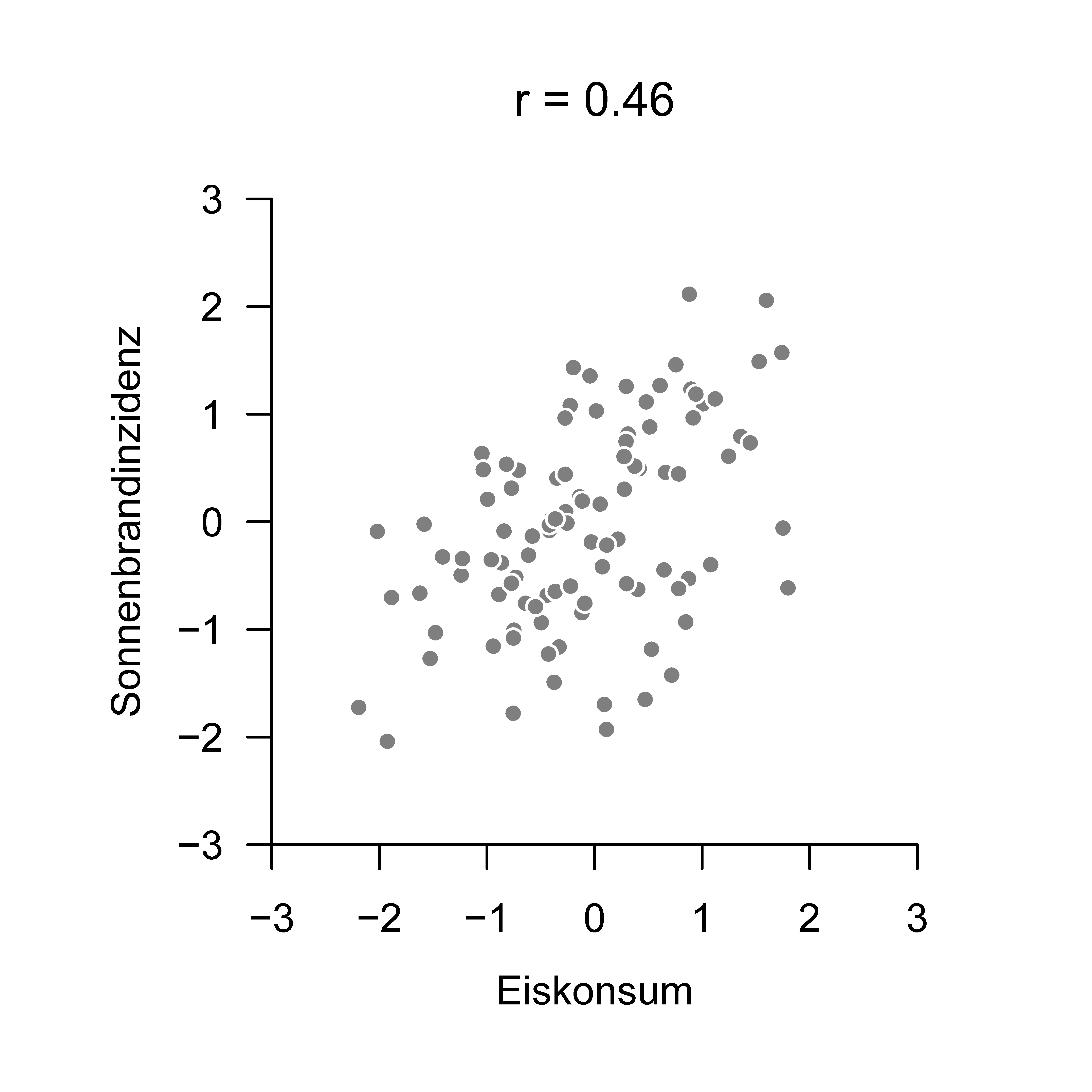 Zur Motivation des Begriffs der partiellen Korrelation betrachten wir zunächst den in Abbildung 43.1 visualisierten Beispieldatensatz zum Zusammenhang von Eiskonsum und Sonnenbrandinzidenz. Wir stellen uns vor, dass jeder der in Abbildung 43.1 abgebildeten Datenpunkte ein Wertepaar aus einem durchschnittlichen und normalisierten Eiskonsum und einer durchschnittlichen und normalisierten Sonnenbrandinzidenz eines Landes über einen gewissen Erhebungszeitraum ist. Visuell betrachtet sieht man eine Tendenz dafür, dass hohe Werte des Eiskonsums mit eher hohen Werten der Sonnenbrandinzidenz auftreten, während niedrige Werte des Eiskonsums mit eher niedrigen Werten der Sonnenbrandinziden zusammen auftreten. Die Bestimmung des Stichprobenkorrelationskoeffizienten zu diesem Datensatz ergibt mit \(r=0.46\) eine mittelstarke positive Korrelation.