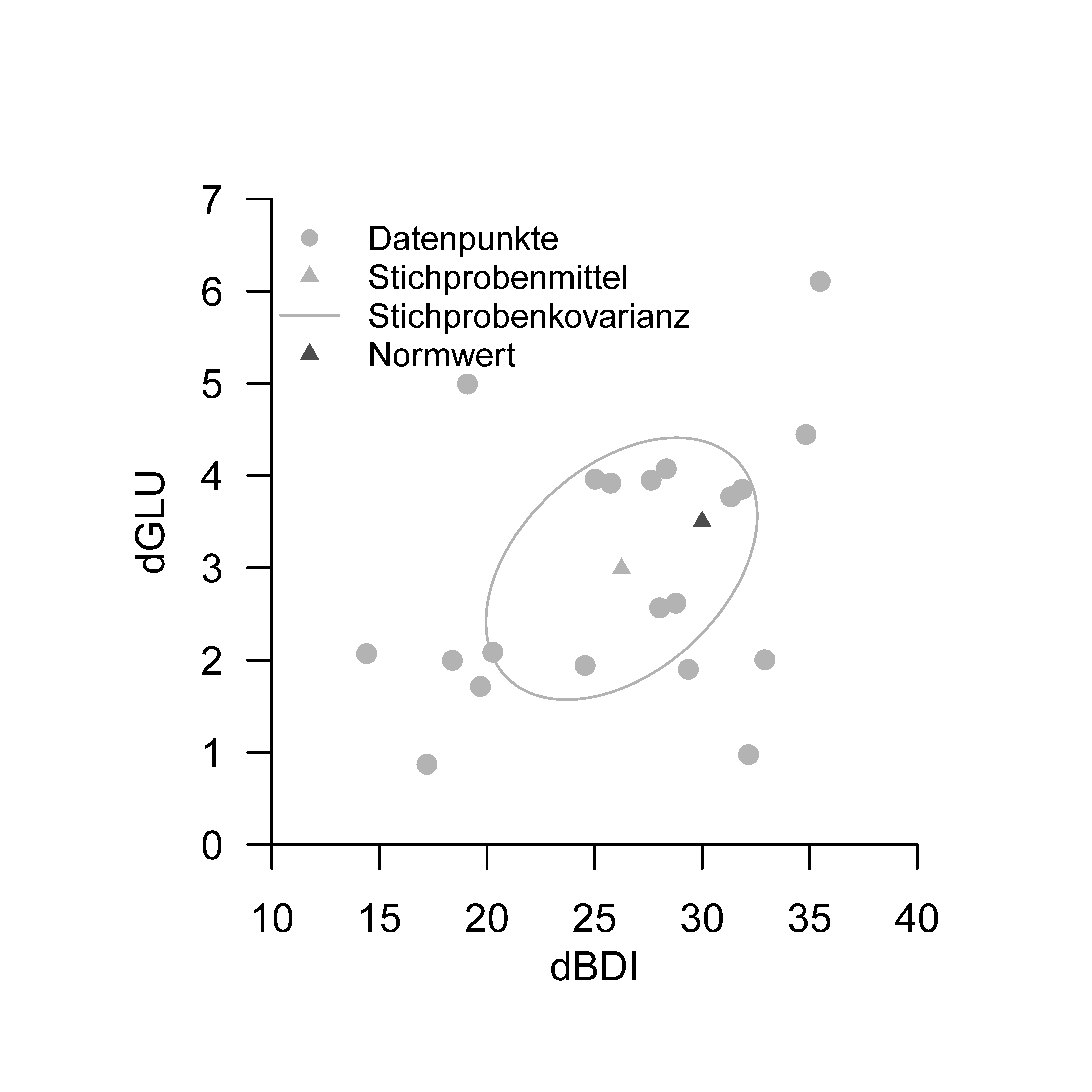 Bei der Anwendung eines Einstichproben-T\(^2\)-Tests auf die Daten dieses simulierten Datensatzes nehmen wir an, dass die zweidimensionalen Datenvektoren (dBDI