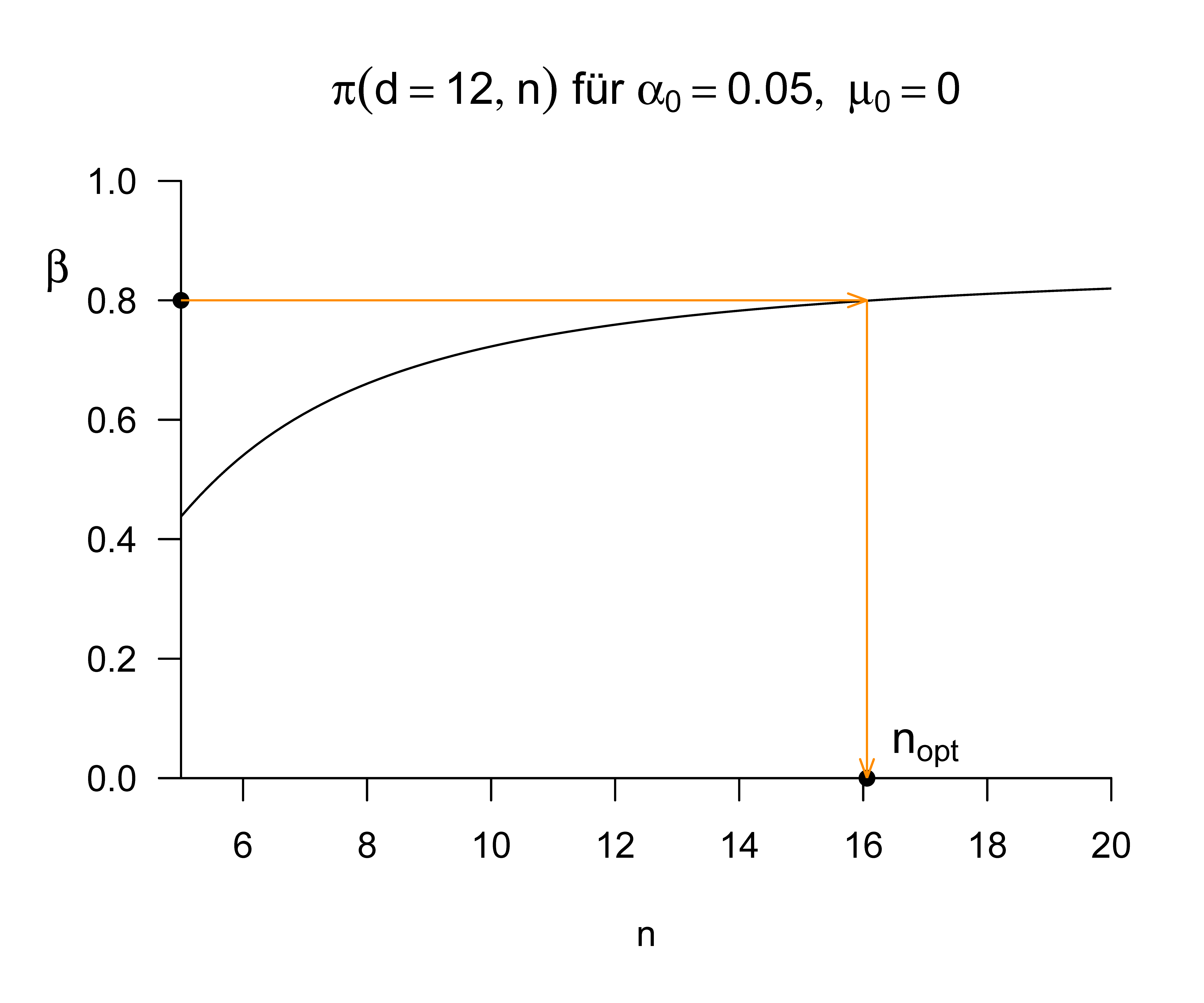 - Basierend auf der evaluierten Powerfunktion liest man die für \[\begin{equation} \pi(\delta_\mu = \delta_\mu^*,n) = \beta \end{equation}\] minimal nötige Stichprobengröße \(n\) ab. Größere Stichprobengrößen führen aufgrund der Monotonie von \(\pi\) als Funktion von \(n\) sicher zu einer gleichen oder höheren Wahrscheinlichkeit für das Ablehnen der Nullhypothese.