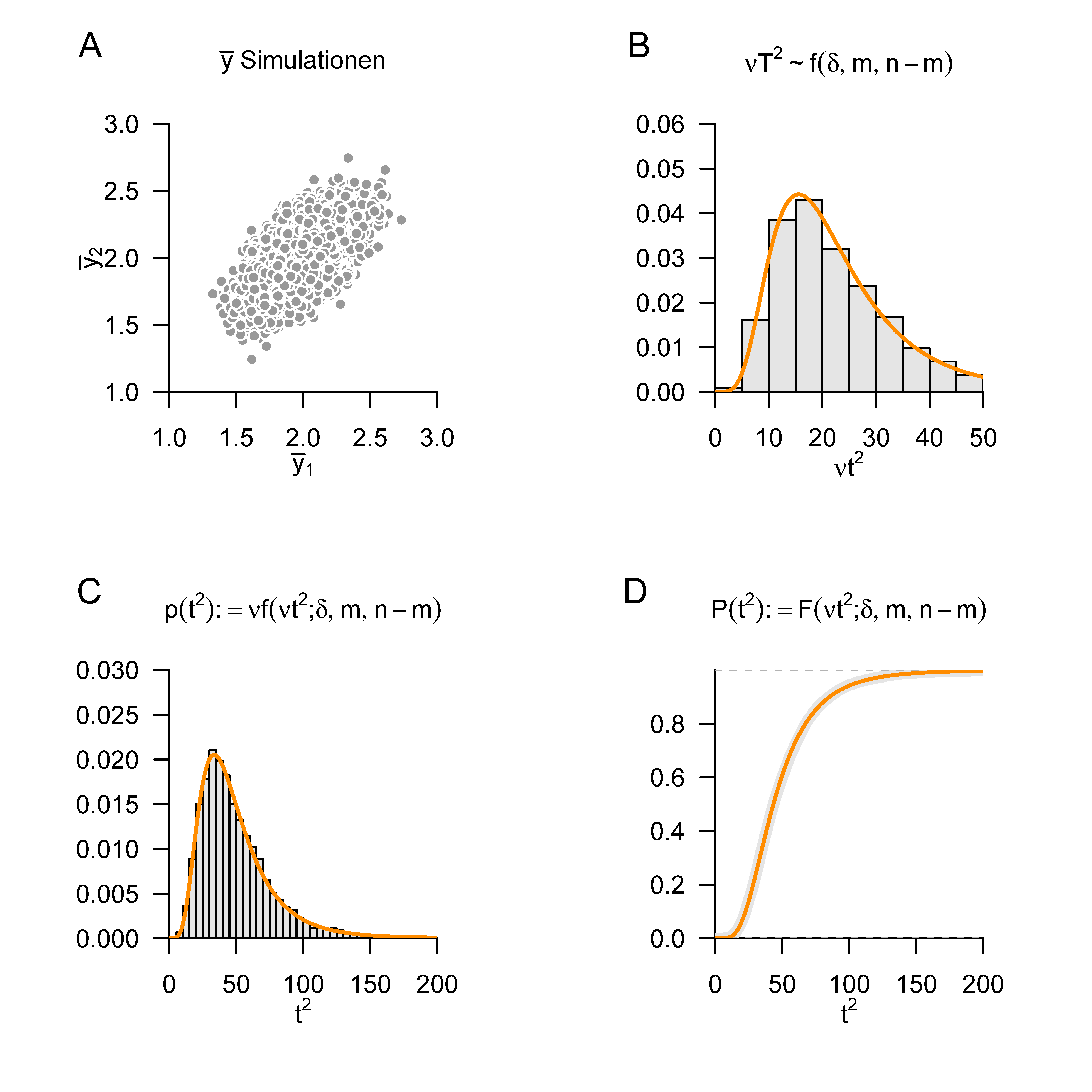 Theorem 46.1 (Verteilung der skalierten Einstichproben-T\(^2\)-Teststatistik) Es seien \(y_1,...,y_n \sim N(\mu,\Sigma)\) mit \(\mu \in \mathbb{R}^m\) und \(\Sigma \in \mathbb{R}^{m\times m} \mbox{pd}\), \[ \nu:= \frac{n-m}{(n-1)m} \tag{46.3}\] und für \(\mu \in \mathbb{R}^m\) sei die Einstichproben-T\(^2\)-Teststatistik definiert als \[\begin{equation} T^2 := n(\bar{y} - \mu_0)^T C^{-1} (\bar{y} - \mu_0). \end{equation}\] Dann gilt \[ \nu T^2 \sim f(\delta, m, n-m), \tag{46.4}\] wobei \(f(\delta,m,n-m)\) die nichtzentrale \(f\)-Verteilung mit Nichtzentralitätsparameter \[ \delta := n(\mu - \mu_0)^T\Sigma^{-1}(\mu - \mu_0) \tag{46.5}\] sowie mit Freiheitsgradparametern \(m\) und \(n-m\) bezeichnet.