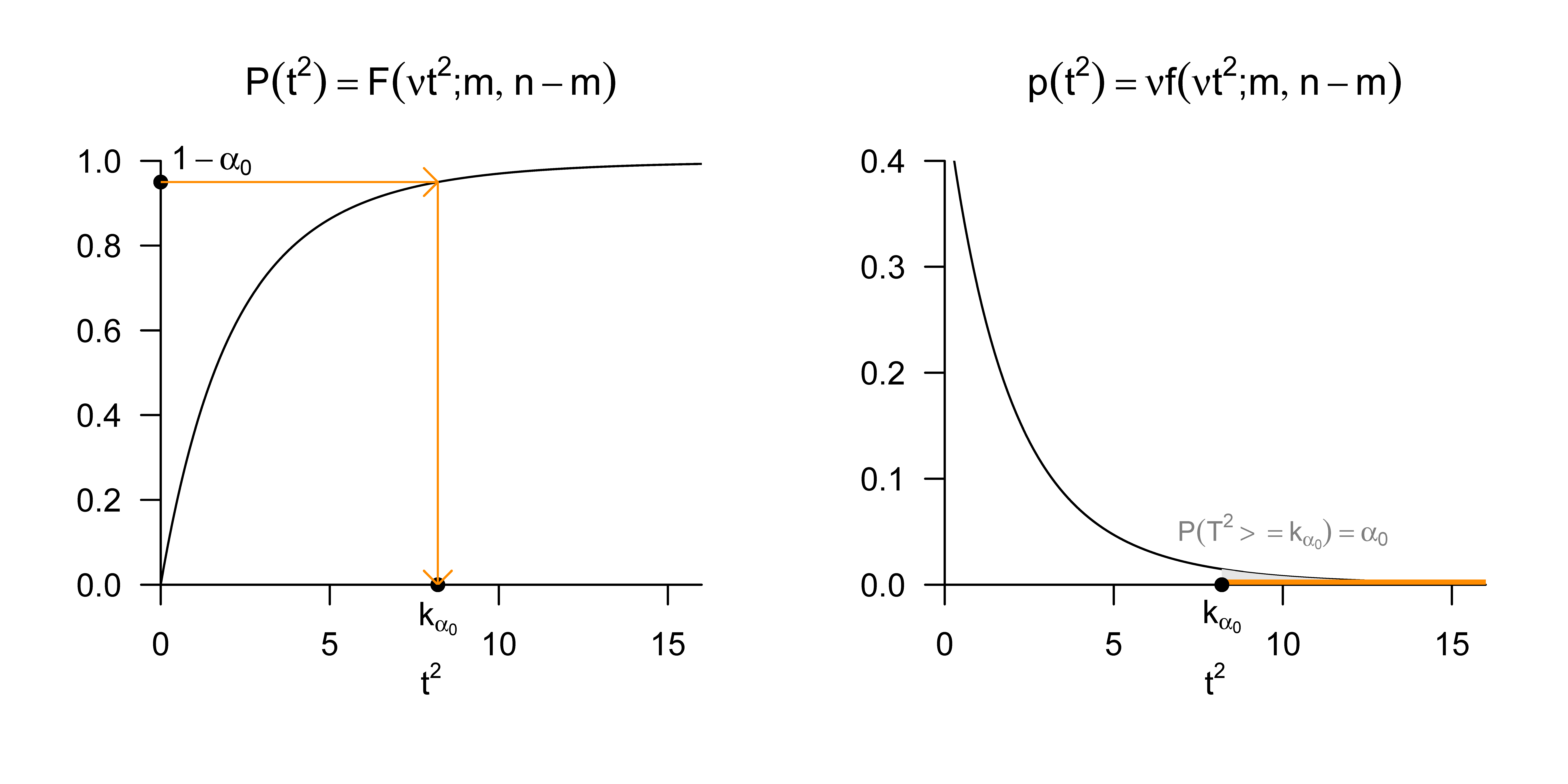 Theorem 46.2 (WDF und KDF der Einstichproben-T\(^2\)-Teststatistik) Im Einstichproben-T\(^2\)-Test Szenario sei \[\begin{equation} \nu:= \frac{n-m}{(n-1)m} \end{equation}\] Dann ist eine WDF der Einstichproben-T\(^2\)-Teststatistik gegeben durch \[\begin{equation}\label{eq:pT1} p_{T^2} : \mathbb{R}_{\ge 0} \to \mathbb{R}, t^2 \mapsto p_{T^2}(t^2) := \nu f(\nu t^2;\delta, m,n-m) \end{equation}\] und eine KVF der Einstichproben-T\(^2\)-Teststatistik ist gegeben durch \[\begin{equation}\label{eq:PT2} P_{T^2} : \mathbb{R}_{\ge 0} \to [0,1], t^2 \mapsto P_{T^2}(t^2) := F(\nu t^2;\delta, m,n-m) \end{equation}\]