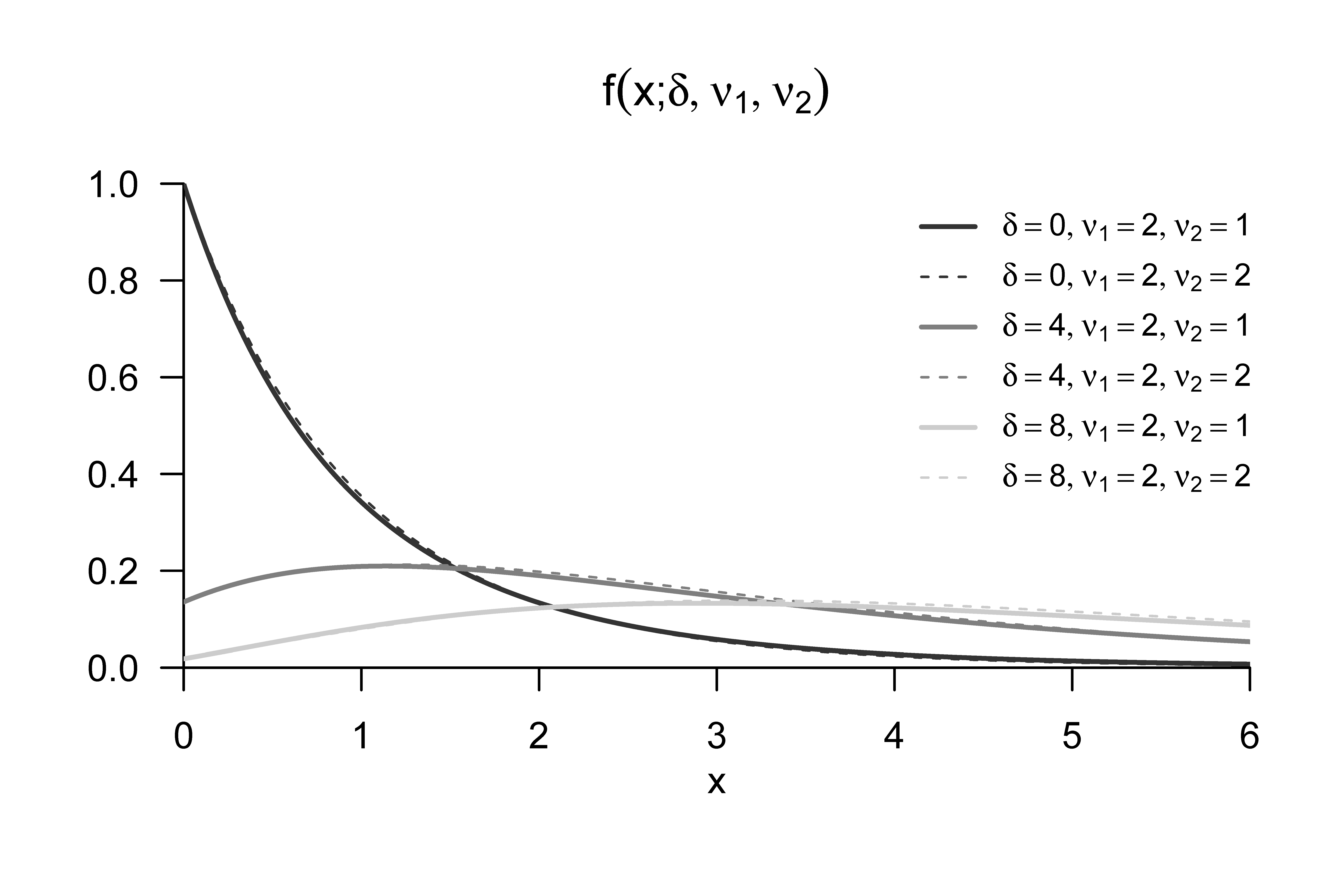Definition 46.4 (Nichtzentrale \(f\)-Zufallsvariable) \(\xi\) sei eine Zufallsvariable mit Ergebnisraum \(\mathbb{R}_{>0}\) und WDF \[\begin{multline} p_\xi : \mathbb{R} \to \mathbb{R}_{>0}, x \mapsto \\ p_\xi(x) := \sum_{k=0}^\infty \frac{e^{-\delta/2}(\delta/2)^k}{\frac{\Gamma(\nu_2/2)\Gamma(\nu_1/2 + k)}{\Gamma(\nu_2/2 + \nu_1/2 + k)}k!} \left(\frac{\nu_1}{\nu_2}\right)^{\nu_1/2 + k} \left(\frac{\nu_2}{\nu_2+\nu_1x}\right)^{(\nu_1+\nu_2)/2 + k} x^{\nu_1/2 - 1 + k} \end{multline}\] wobei \(\Gamma\) die Gammafunktion bezeichne. Dann sagen wir, dass \(\xi\) einer nichtzentralen \(f\)-Verteilung mit Nichtzentralitätsparameter \(\delta\) und Freiheitsgradparametern \(\nu_1\) und \(\nu_2\) unterliegt und nennen \(\xi\) eine nichtzentrale \(f\)-Zufallsvariable mit Nichtzentralitätsparameter \(\delta\) und Freiheitsgradparametern \(\nu_1\) und \(\nu_2\). Wir kürzen dies mit \(\xi \sim f(\delta,\nu_1,\nu_2)\) ab. Die WDF einer \(f\)-Zufallsvariable bezeichnen wir mit \(f(x;\delta,\nu_1,\nu_2)\), die KVF einer nichtzentralen \(f\)-Zufallsvariable bezeichnen wir mit \(F(x;\delta,\nu_1,\nu_2)\), und die inverse KVF einer nichtzentralen \(f\)-Zufallsvariable bezeichnen wir mit \(F^{-1}(x;\delta,\nu_1,\nu_2)\).