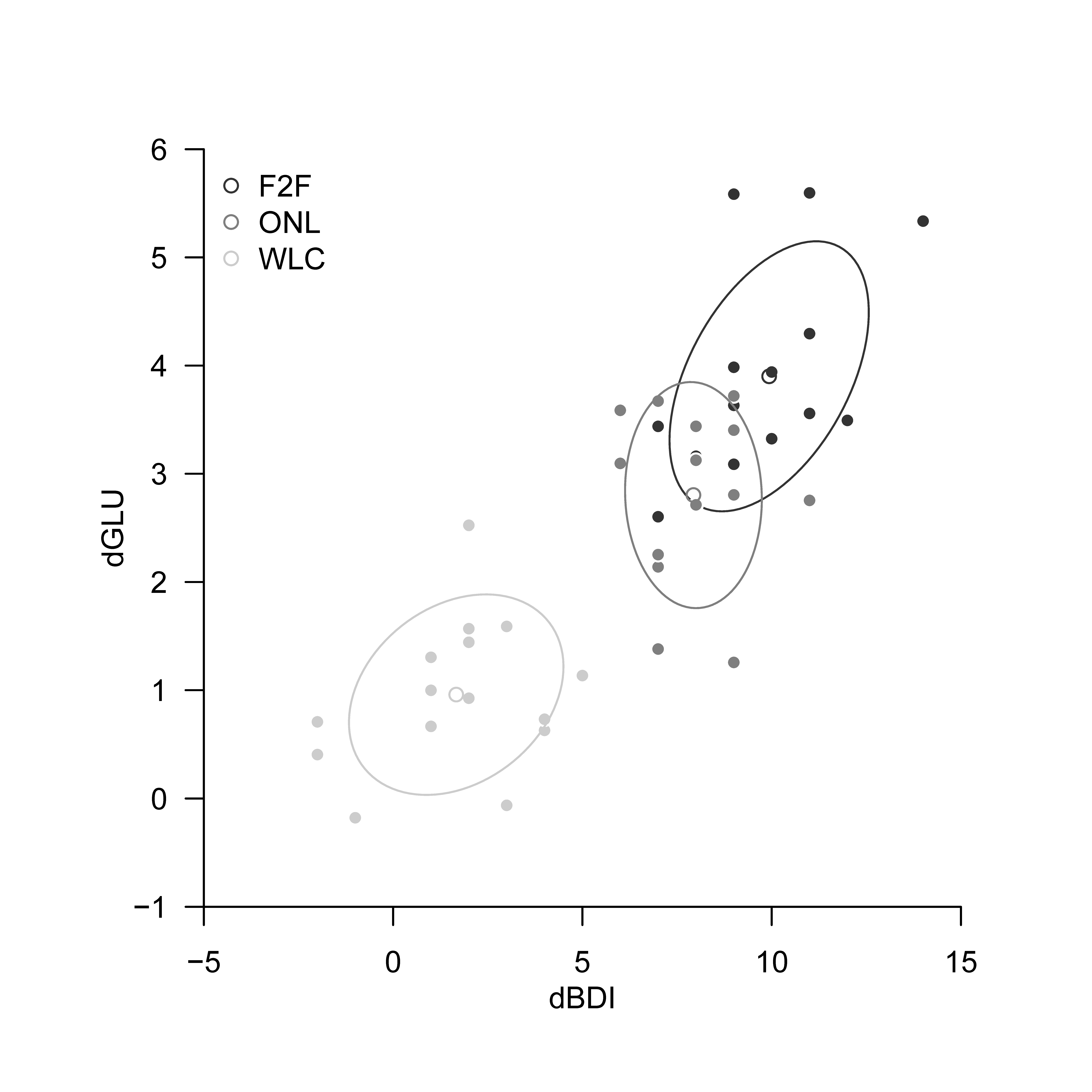 ) die entsprechenden Glukokortikoidplasmalevel-Differenzwerte auf. In beiden Fällen zeigen positive Werte eine Abnahme der Depressionssymptomatik, negative Werte dagegen einer Zunahme der Depressionssymptomatik an. Abbildung 47.1 visualisiert diesen Datensatz sowie die gruppenspezifischen Stichprobenmittel und Stichprobenkovarianzen als Normalverteilungsisokonturen.