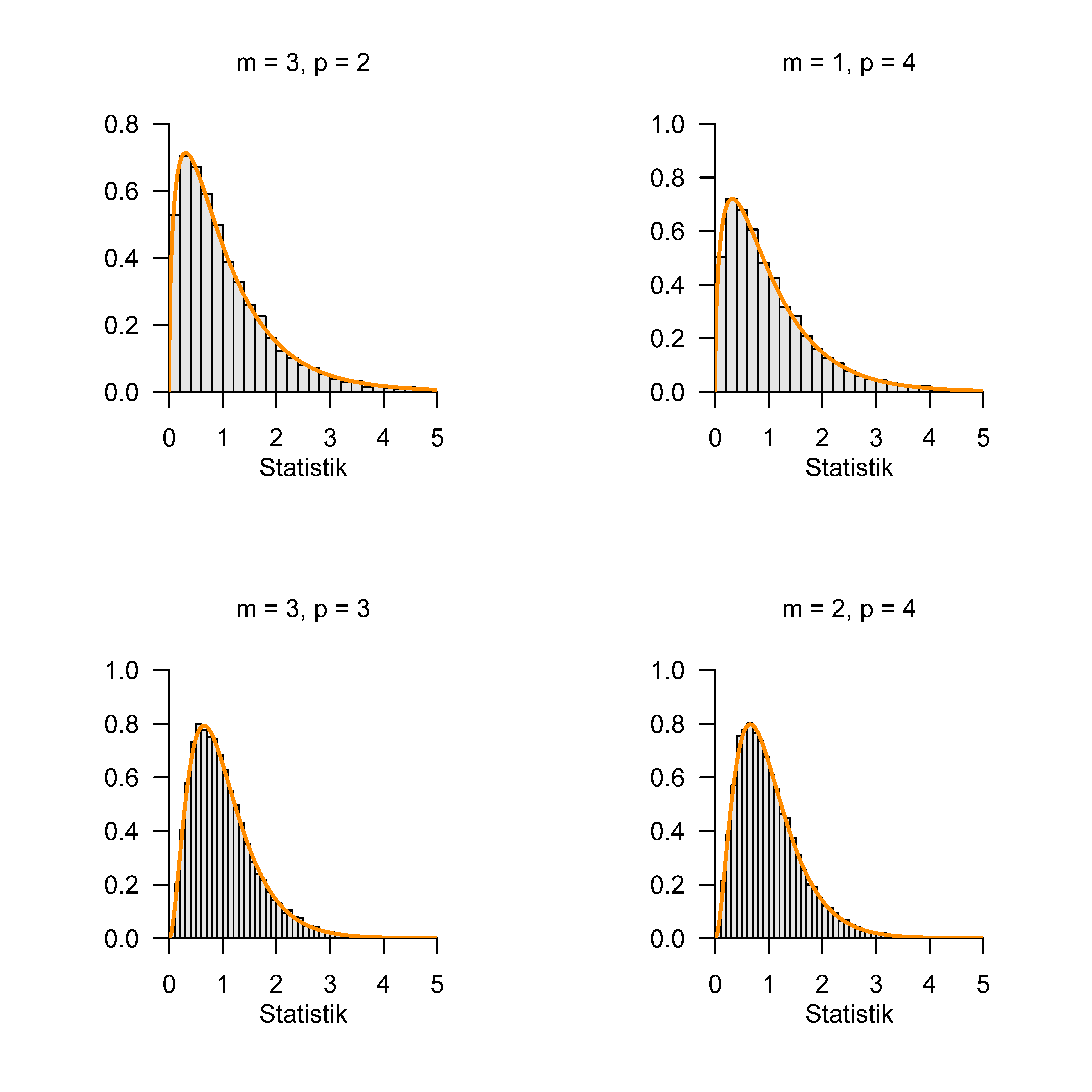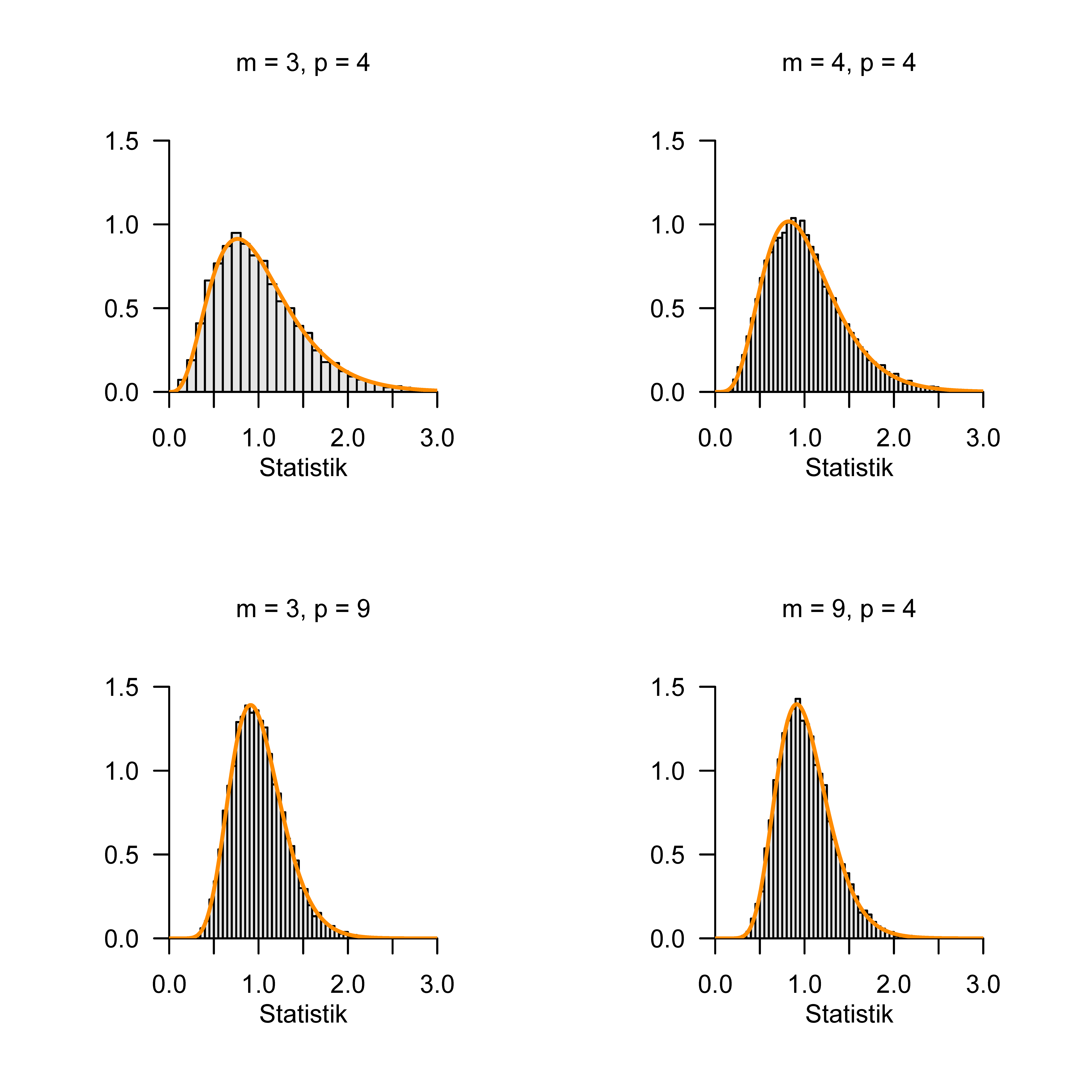 Es seien das Modell der einfaktoriellen Varianzanalyse und die Wilks’-\(\Lambda\)-Statistik definiert wie oben und es gelte außerdem die Nullhypothese \[\begin{equation} H_0 : \mu_1 = \cdots = \mu_p. \end{equation}\] Dann sind für die in den ersten beiden Tabellenspalten aufgeführten Spezialfällen die in der dritten Tabellenspalte aufgeführten Statistiken \(f\)-Zufallsvariablen und zwar mit den in der vierten Tabellenspalte aufgeführten Freiheitsgradparametern.In Abbildung 47.3 visualisieren wir exemplarische simulationsbasierte Validierungen der in Theorem 47.4 angegebenen Verteilungen.
