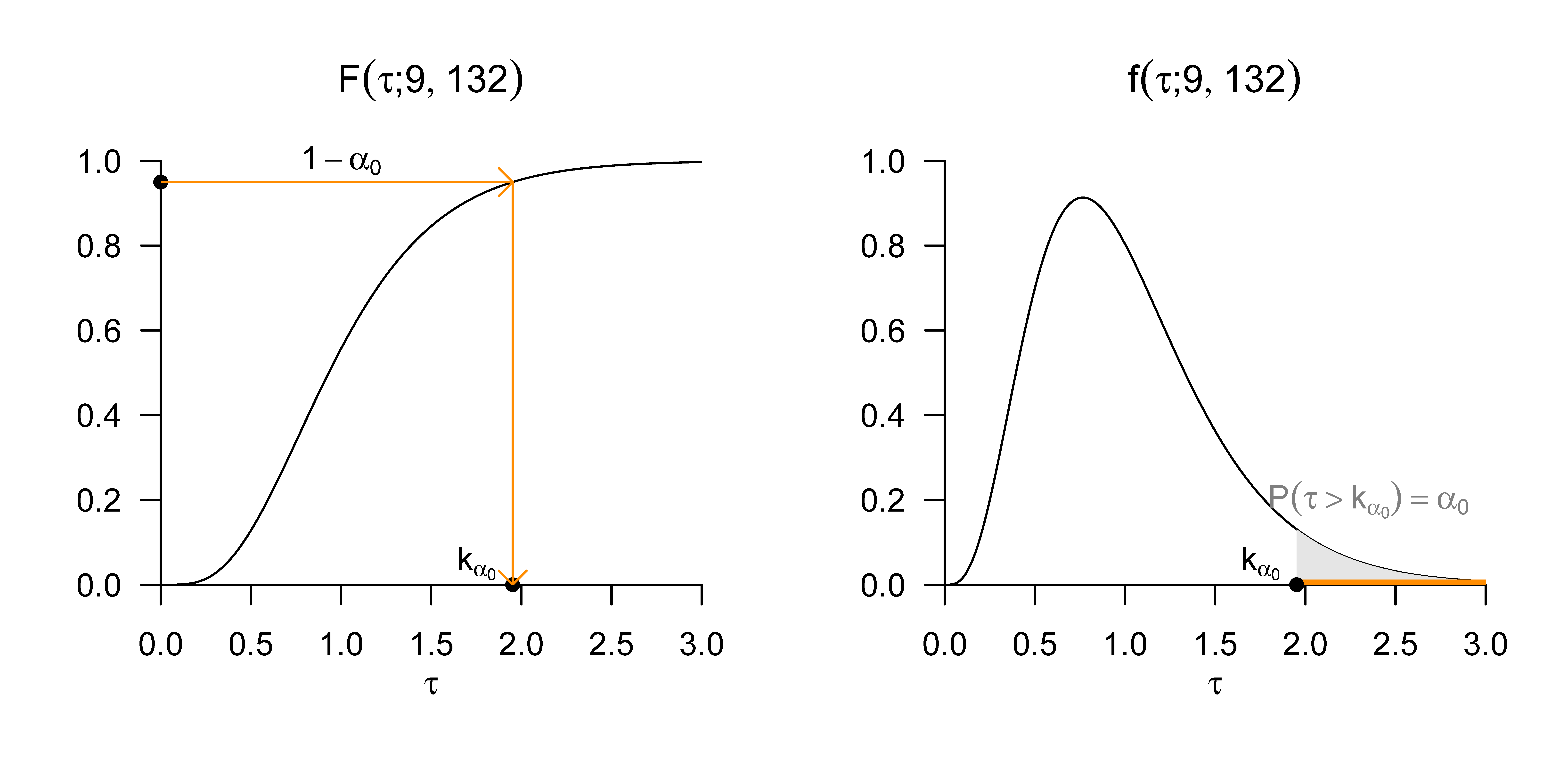 Wir verzichten auf einen Beweis von Theorem 47.6, welcher analog zu den entsprechenden Beweisen zum Beispiel beim Einstichproben-T\(^2\)-Test geführt werden kann. Die in Theorem 47.6 implizite Wahl eines kritischen Wertes zur Testumfangkontrolle im Anwendungsszenario \(m := 3, p := 4\) und \(n_i = 15\) für \(i = 1,..,p\) und damit \(\nu_1 = 9\) und \(\nu_2 = 132\) bei einem Signifikanzlevel von \(\alpha_0 = 0.05\) visualisieren wir in Abbildung 47.6.
