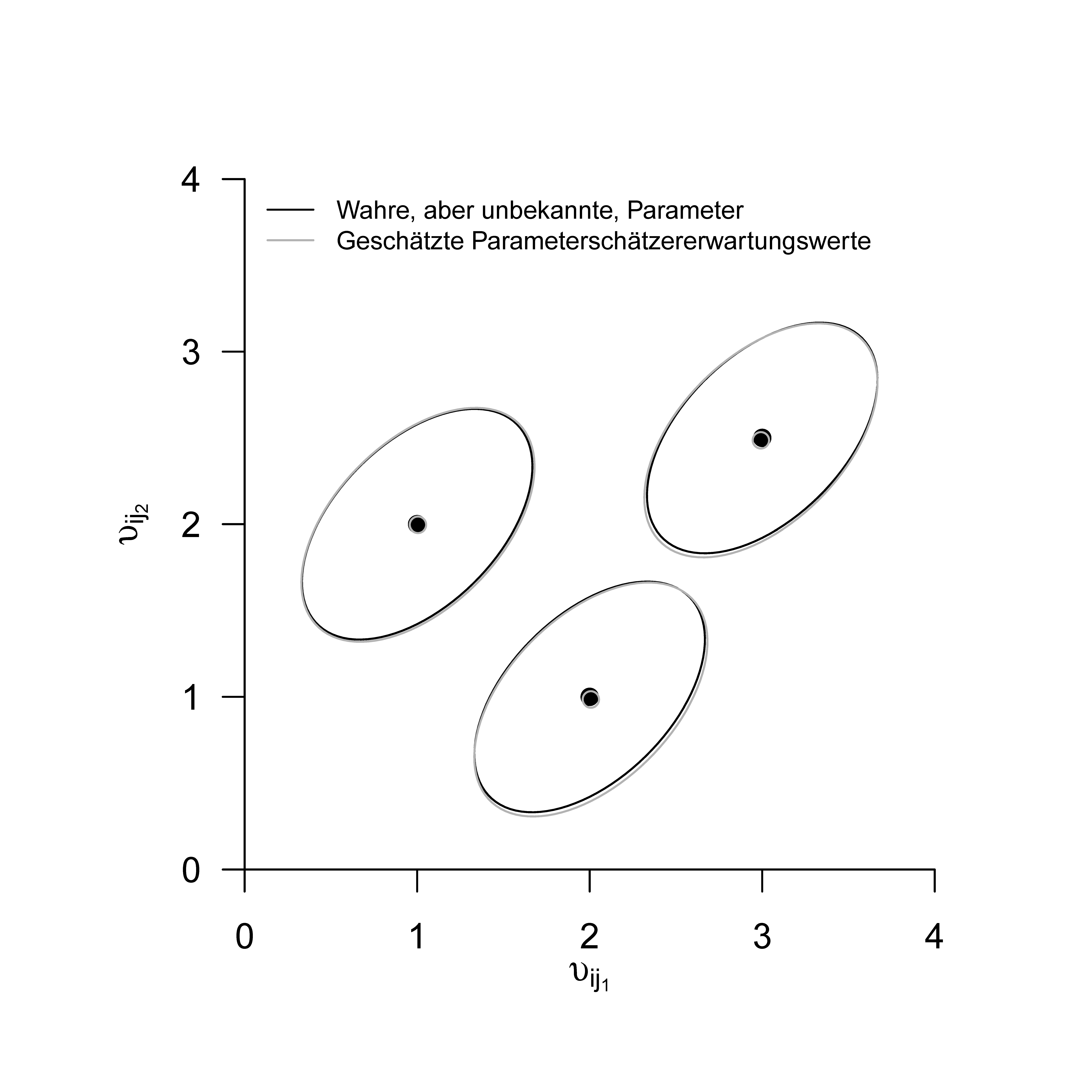 Theorem 47.1 (Parameterschätzer der einfaktoriellen multivariaten Varianzanalyse) Gegeben sei das Modell der einfaktoriellen multivariaten Varianzanalyse. Dann ist für \(i = 1,...,p\) \[\begin{equation} \hat{\mu}_i := \frac{1}{n_i}\sum_{j = 1}^{n_i} y_{ij} \end{equation}\] ein unverzerrte Schätzer des gruppenspezifischen Erwartungswertparameters \(\mu_i\) und \[\begin{equation} \hat{\Sigma} := \frac{1}{n-p}\sum_{i = 1}^p \sum_{j = 1}^{n_i} \left(y_{ij} - \hat{\mu}_i\right)\left(y_{ij} - \hat{\mu}_i\right)^T \end{equation}\] ein unverzerrter Schätzer des Kovarianzmatrixparameters \(\Sigma\).