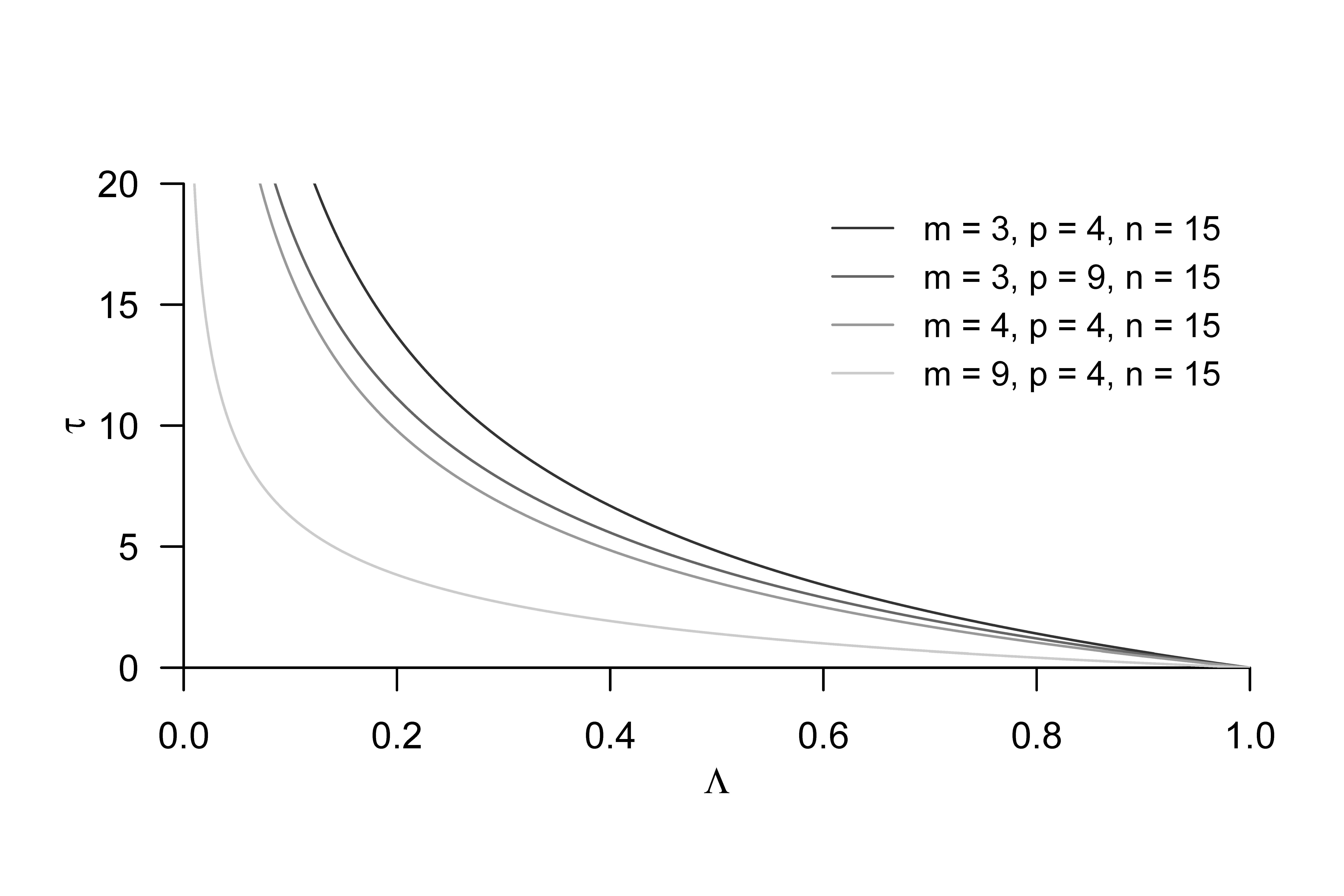 Rao (1951) hat für allgemeine Anwendungsszenarien die in folgendem Theorem angegebenen Approximationen von Verteilungen von Transformationen der Wilks’-\(Lambda\)-Statistik vorgeschlagen. Man beachte, dass sich die in diesem Theorem definierte Teststatistik \(\tau\) wie in Abbildung 47.4 gezeigt zu \(\Lambda\) reziprok verhält. Geringe Werte von \(\Lambda\) als Evidenz gegen die Nullhypothese entsprechen also hohen Werten von \(\tau\).
