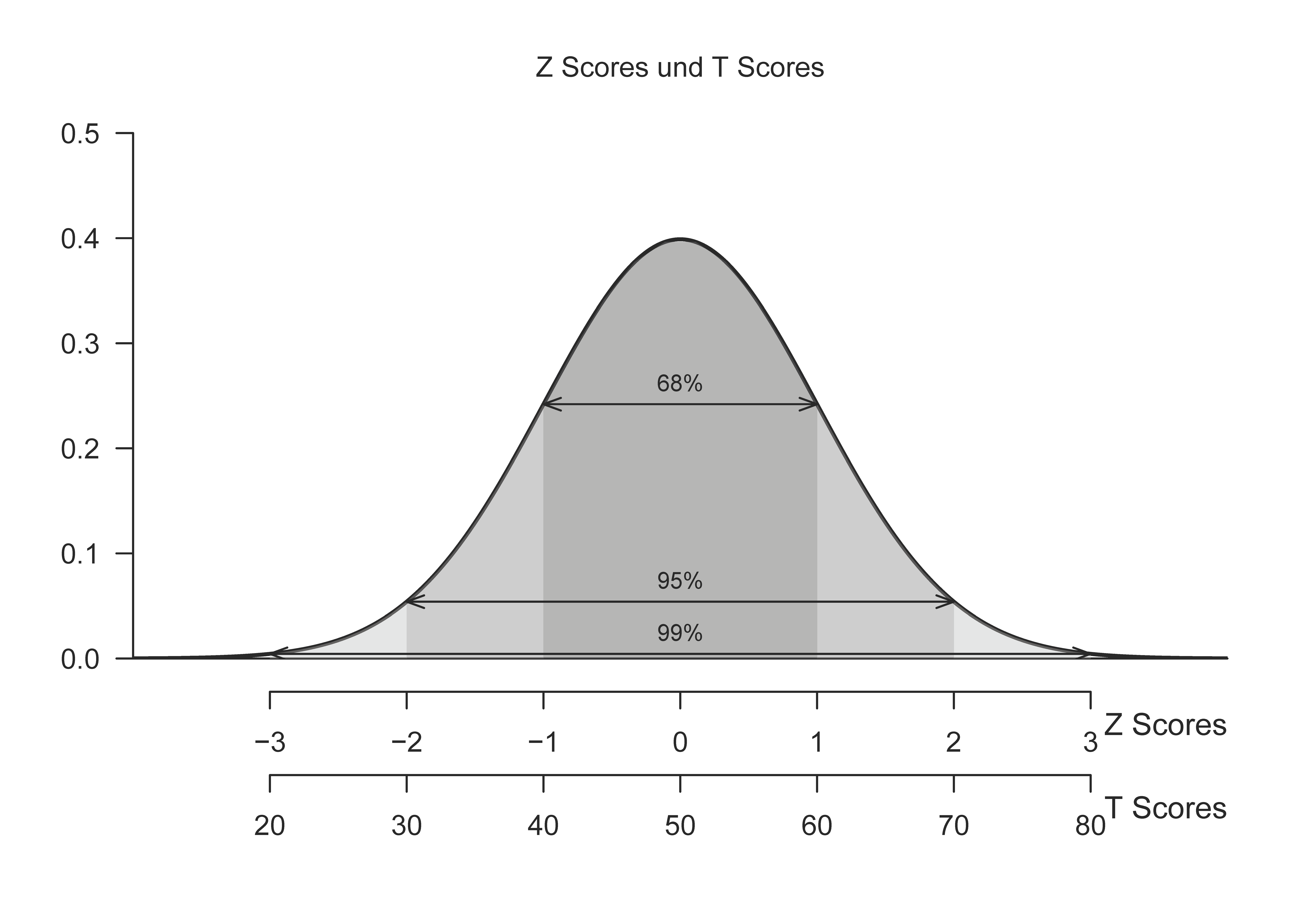 Nun hat eine standardnormalverteilte Zufallsvariable die Eigenschaft, mit höchster Wahrscheinlichkeit einen Wert zwischen \(-3\) und \(3\) anzunehmen. Dies mag manchmal unpraktisch erscheinen, da in diesem Fall ein einzelnes Testergebnis, wenn es unter dem Stichprobenmittelwert liegt, negativ ausfallen kann. Weiterhin erfordert die Angabe eines Ergebnisses mit hinreichender Genauigkeit die Angabe von Nachkommastellen. McCall (1922) hat deshalb vorgeschlagen, eine weitere lineare Transformation der berechneten Z Scores durchzuführen, die die Z Scores in einen zugänglicheren Wertebereich transformiert. Die so transfomierten Z Scores bezeichnet McCall (1922) zu Ehren von Edward Lee Thorndike, Lewis Terman und Louis Leon Thurstone als T Scores. Die Bezeichung T Scores geht also keinesfalls auf die \(T\)-Statistiken der Frequentisischen Inferenz und ihre entsprechenden Verteilungen zurück. Die von McCall (1922) vorgeschlagene Transformation ist durch \[\begin{equation} t^{(i)} := 10z^{(i)} + 50 \end{equation}\] gegeben. Mit der näherungsweisen Standardnormalverteilung von \(z\) ergibt sich entsprechend \[\begin{equation} t \sim N\left(0 + 50, 10^2 \cdot 1\right) = N(50,100). \end{equation}\] T Scores haben näherungsweise also immer einen Erwartunsgwert von 50, eine Varianz von 100 und eine Standardabweichung von 10. Damit liegen dann im T Score Wertebereich von 40 bis 60 etwa 68% der Stichprobenergebnisse, im Wertebereich von 30 bis 70 etwa 95% der Stichprobenergebnisse und im Wertebereich von 20 bis 80 etwa 99% der Stichprobenergebnisse (vgl. Abbildung 49.1).